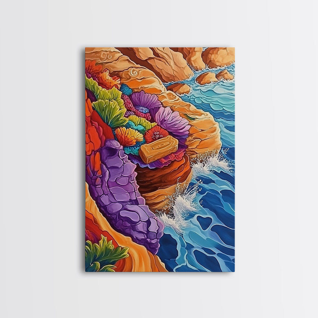 Ocean Cliffs, Colorful Reef, Coastal Abstract, Vibrant Seaside Art, Bathroom Wall Art, Nautical Decor, Canvas Print, Bold Nature Painting