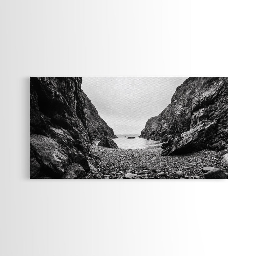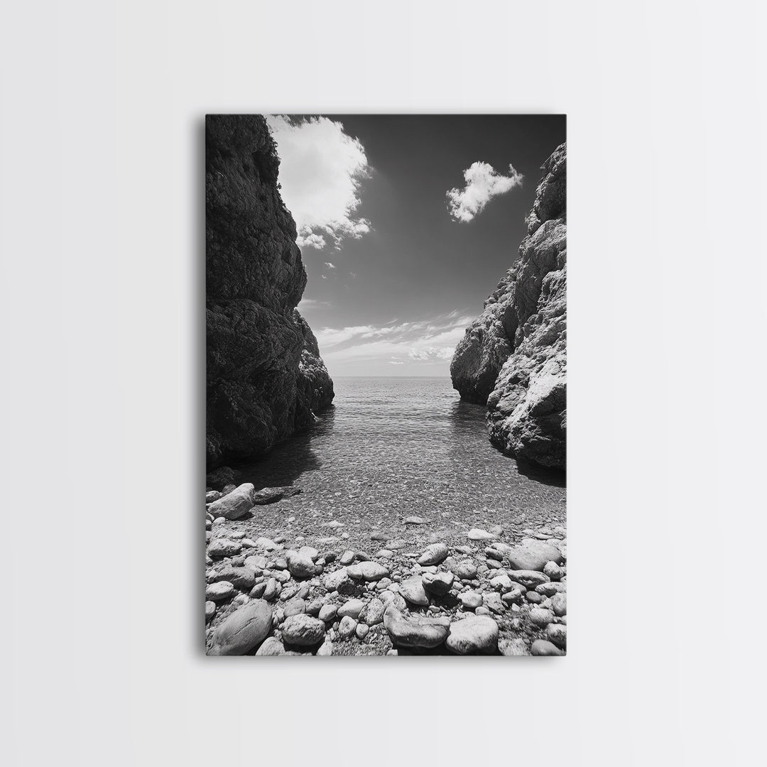 Rocky Cove, Ocean Gap, Cliffside Path, Secluded Coast, Framed Canvas Print, adventure wall art, man cave, grayscale wilderness print
