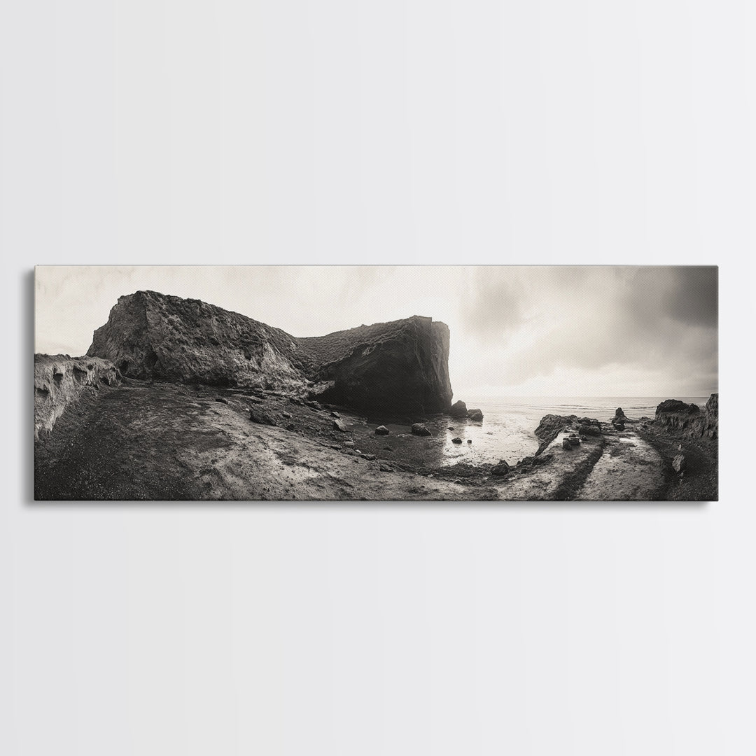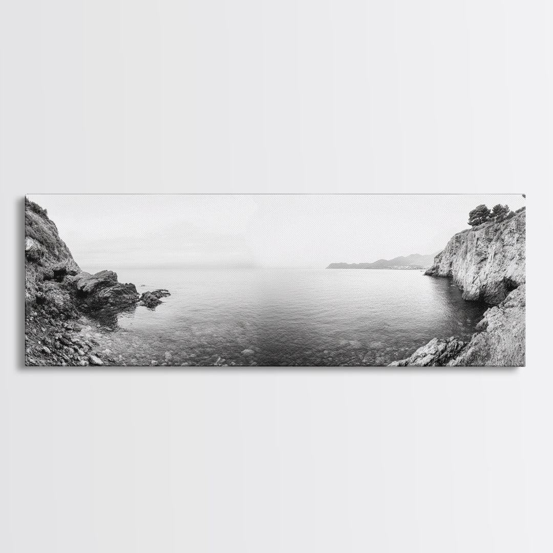 Rocky Coastline, Minimalist Seascape, Black and White Shoreline, Framed Canvas Print, Coastal Wall Art, Bathroom or Hallway Decor