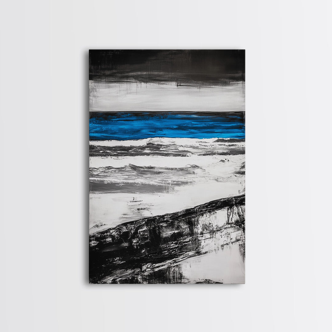 Ocean Horizon, Minimalist Seascape Painting, Black White and Blue Coastal Art, Framed Canvas Print, Modern Living Room or Office Wall Decor