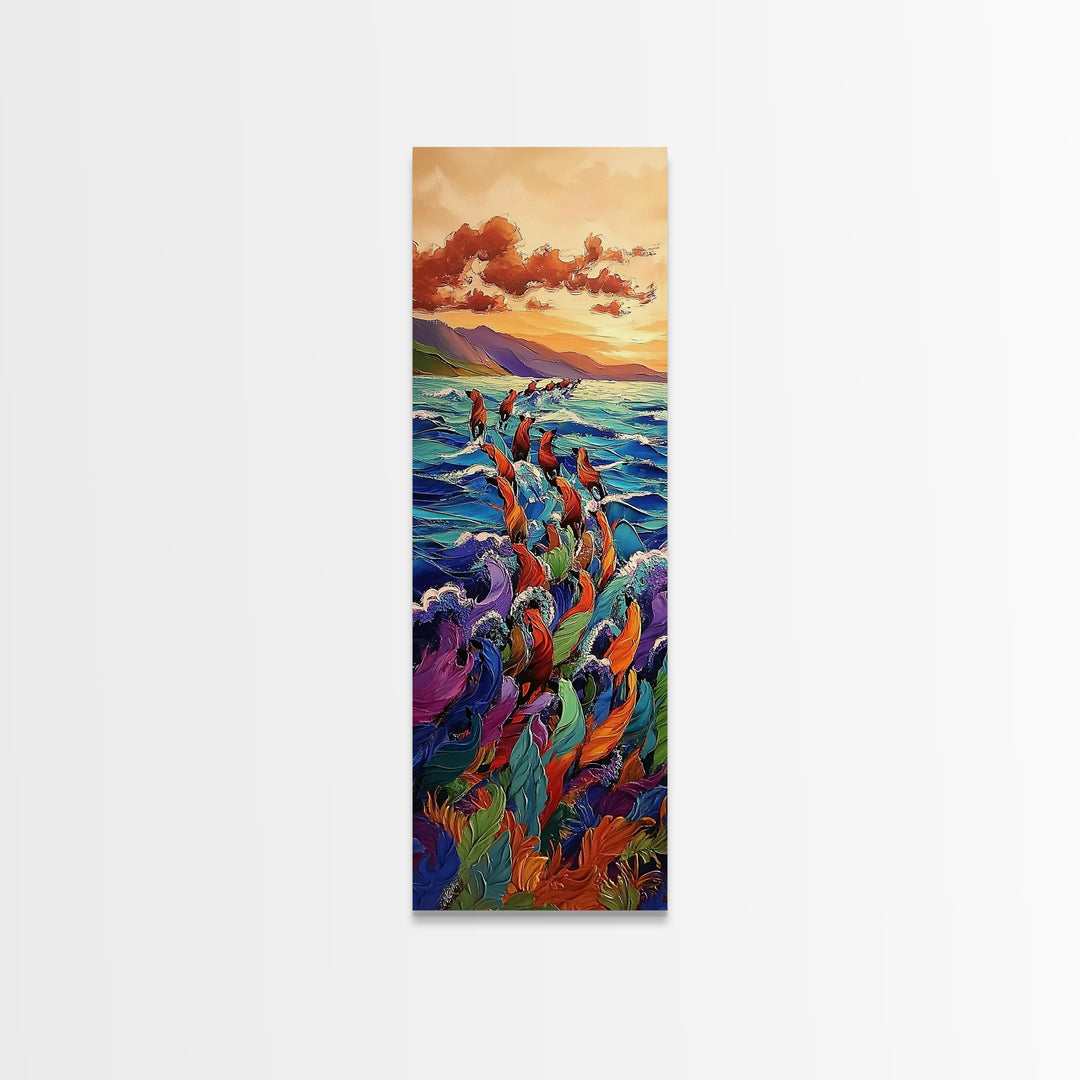 Ocean Journey, Colorful Fish, Sunrise Waves, Framed Canvas Print, vibrant coastal fish painting, kids room or nautical beach house art
