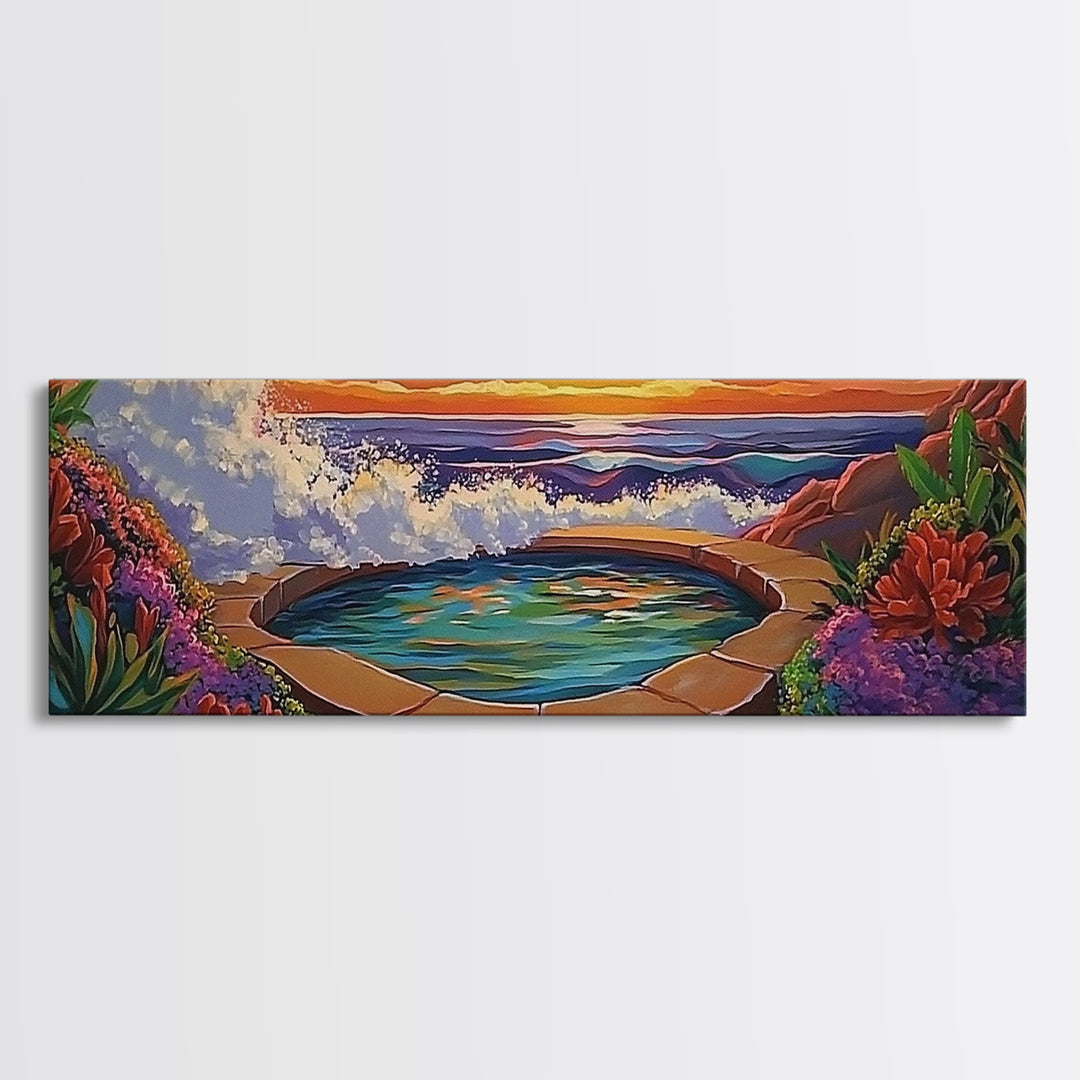Ocean Hot Spring, Tropical Spa Scene, Sunset Serenity, Coastal Zen, Framed Canvas Print, Relaxation Art, Bohemian Wall Art