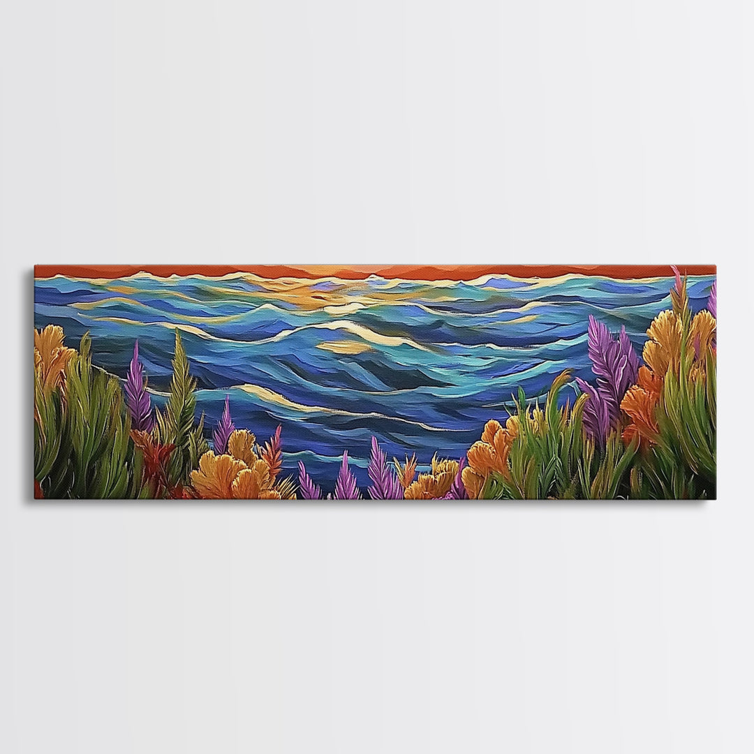 Ocean Horizon, Sunset Sea, Flower Garden, Nature Escape, Canvas Print, Beach House Decor, Tropical Seascape Wall Art