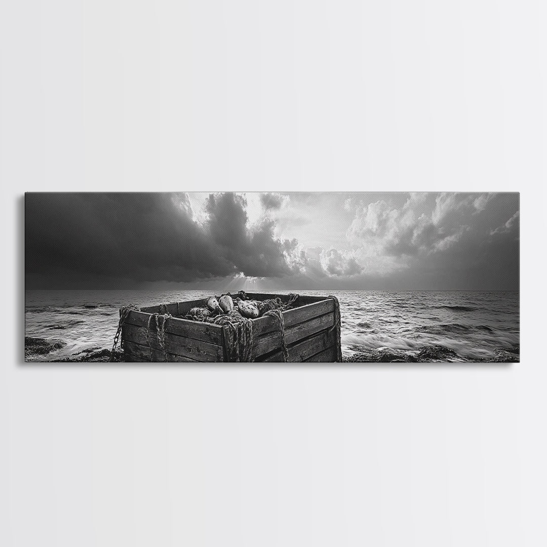 Ocean Harvest, Driftwood Crate, Coastal Mood, Framed Canvas Print, Nautical Wall Decor, Rustic Bathroom Art, Moody Coastal Artwork