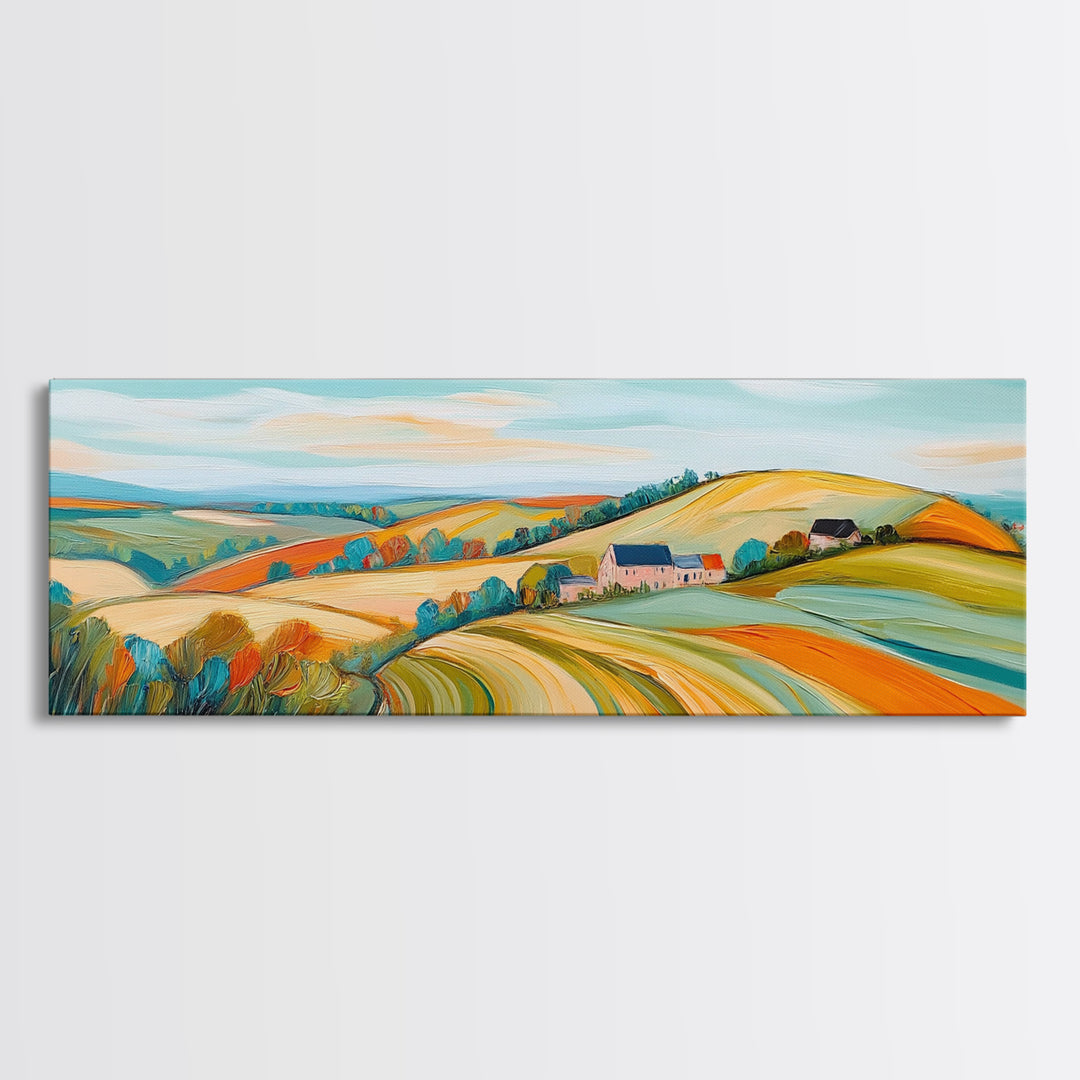 Rolling Hills Farm Framed Canvas Print Country Landscape Art, Cozy Rural Painting, Autumn Wall Decor, Cottagecore Home, Kitchen Art