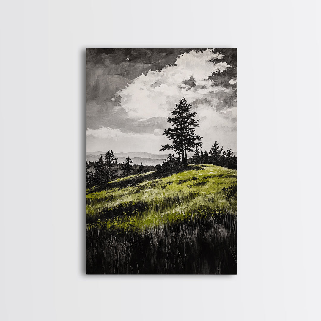 Rolling Hills, Black and White Landscape, Green Meadow Nature Painting, Framed Canvas Print, Cottagecore or Bedroom Wall Art