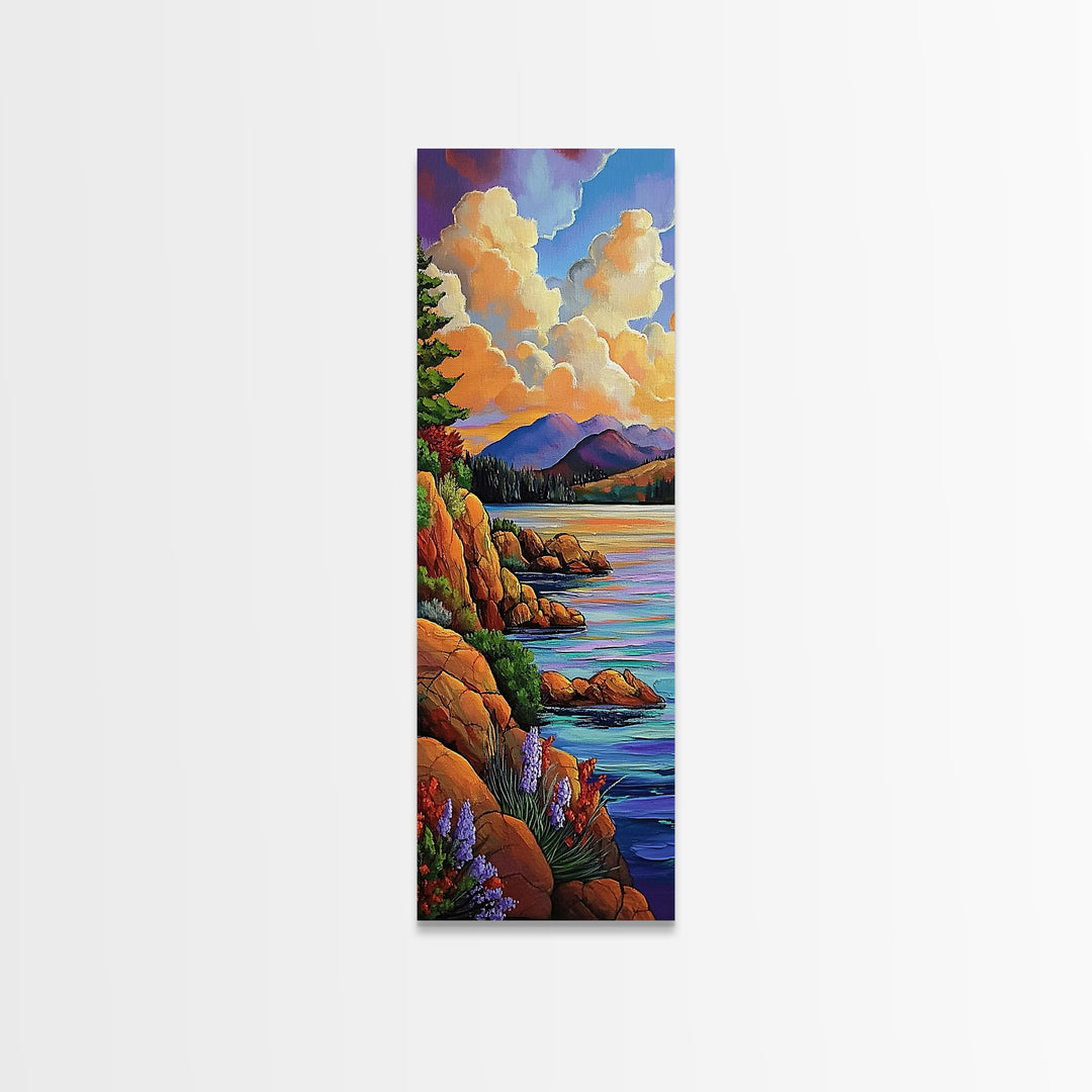 Rocky, Shoreline, Sunset, Mountains, Framed Canvas Print, Nature wall decor in painterly style, great Bedroom Wall Art or Rustic Cottage Decor