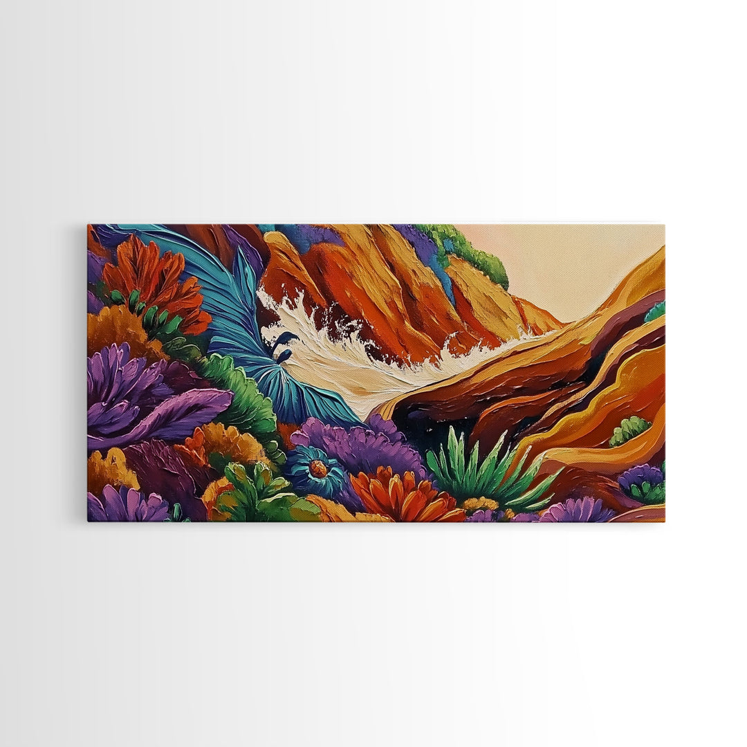 Rocky Waterfall, Moody Landscape, Canvas Print, Nature Painting, Rustic Decor, Adventure Art, Southwest Wall Art, Tall Narrow Art