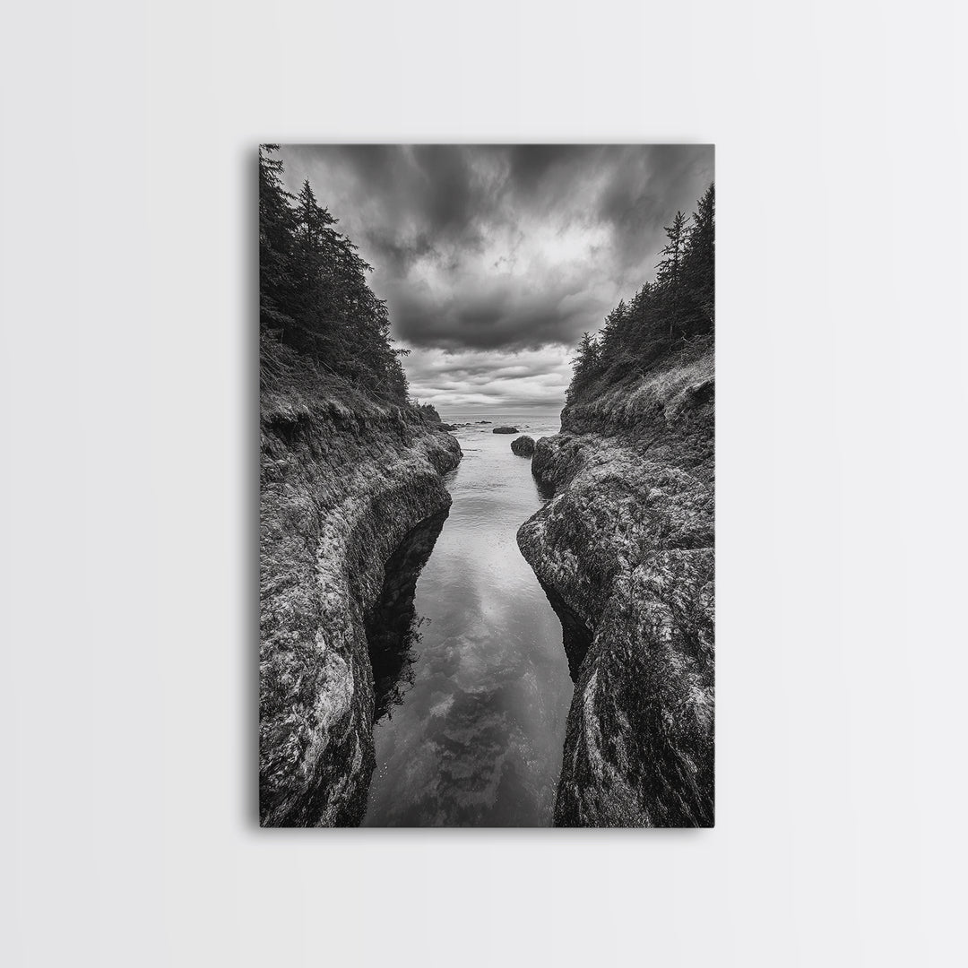 Rocky Waterway, Coastal Reflections, Dramatic Cloudscape, Ocean Nature Print, Framed Canvas Print, Bathroom Wall Art, Modern Rustic Style