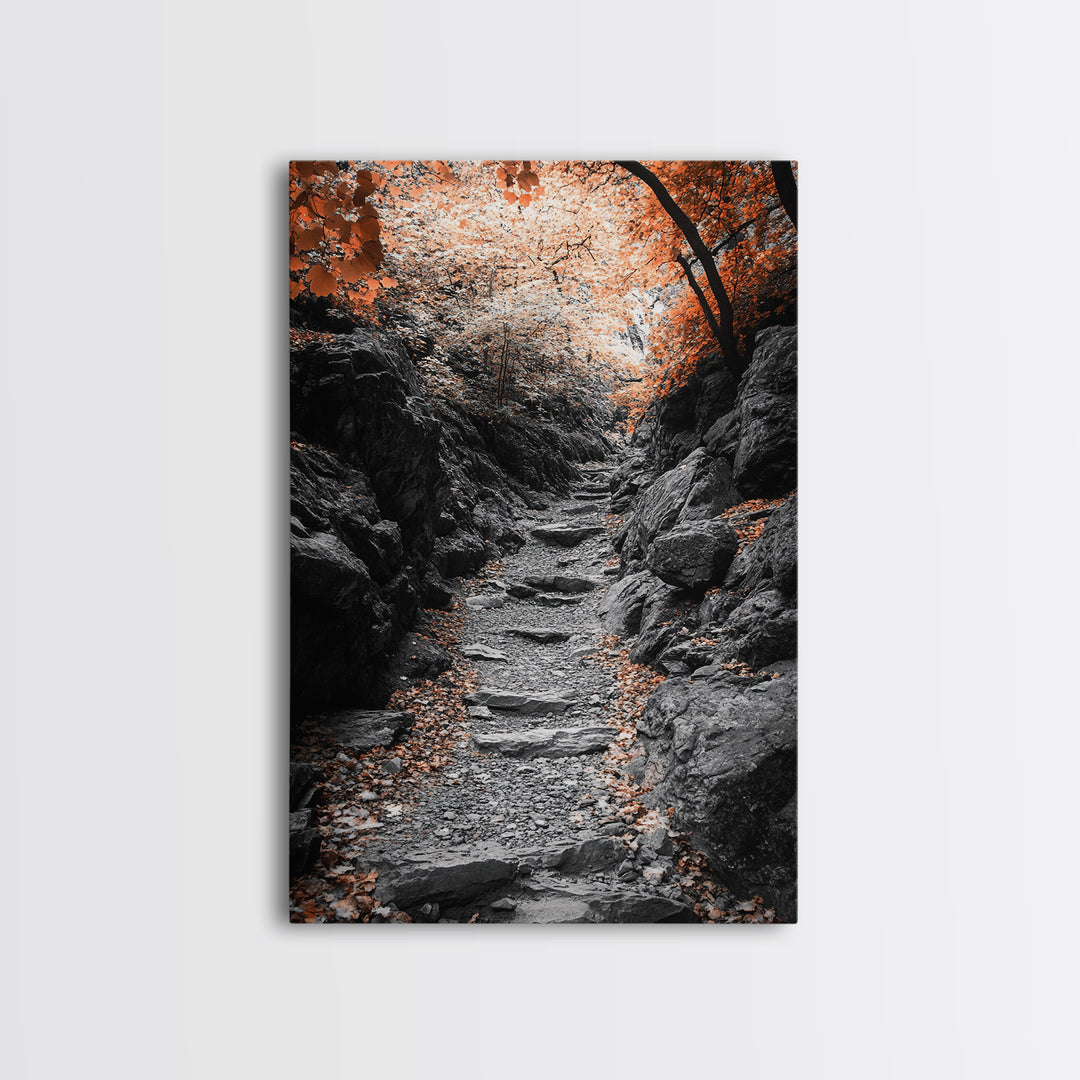 Rocky Trail, Autumn Leaves, Forest Path, Framed Canvas Print, Fall Nature Wall Art, Rustic Entryway Decor, Hiking Landscape Art