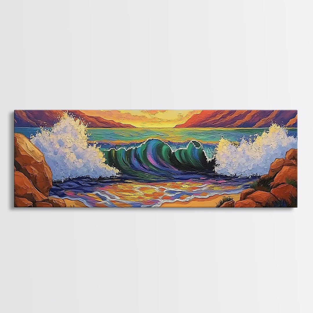 Ocean Power Crash, Colorful Seaside Painting, Bold Wave Art, Framed Canvas Print, Coastal Wall Decor, Beach House Living Room Style