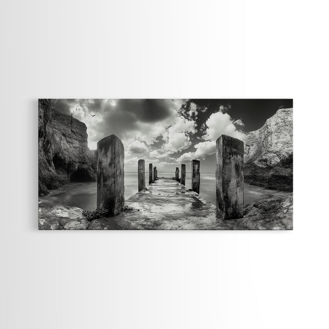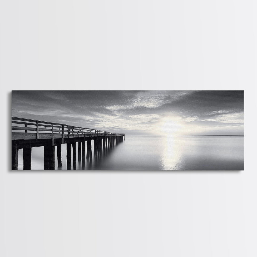 Ocean Pier, Tranquil Horizon, Serene Seascape, Framed Canvas Print, black and white beach wall art, bedroom coastal minimalism