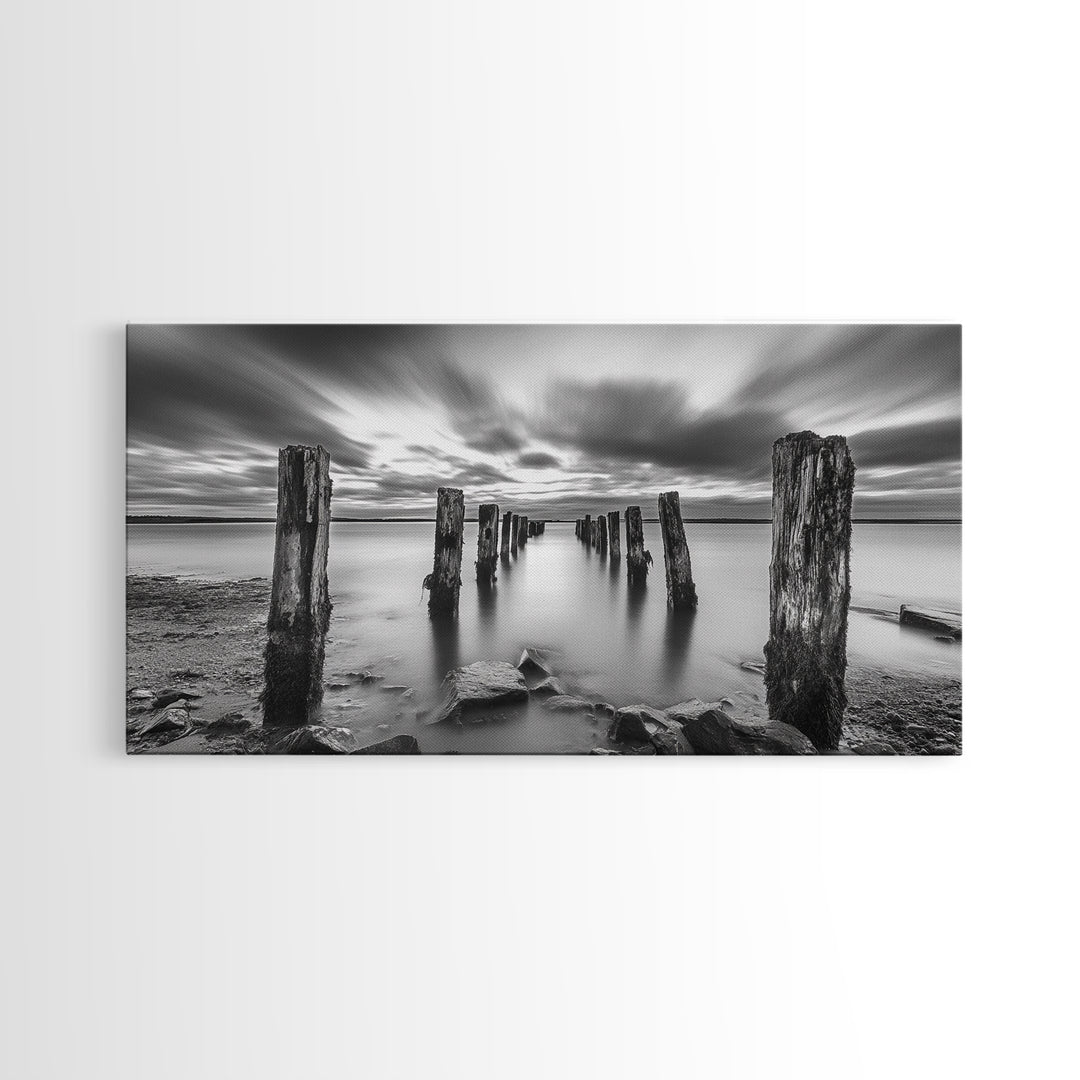 Ocean Pilings, Calm Waters, Cloud Streaks, Sunset Mood, Canvas Print, Minimalist Seascape, Bedroom Wall Art, Serene Beach Decor