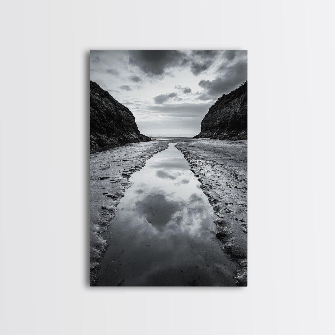 Ocean Reflection, Seaside Path, Moody Coastline, Canvas Print, Black and White Nature Photography, Modern Living Room Wall Art