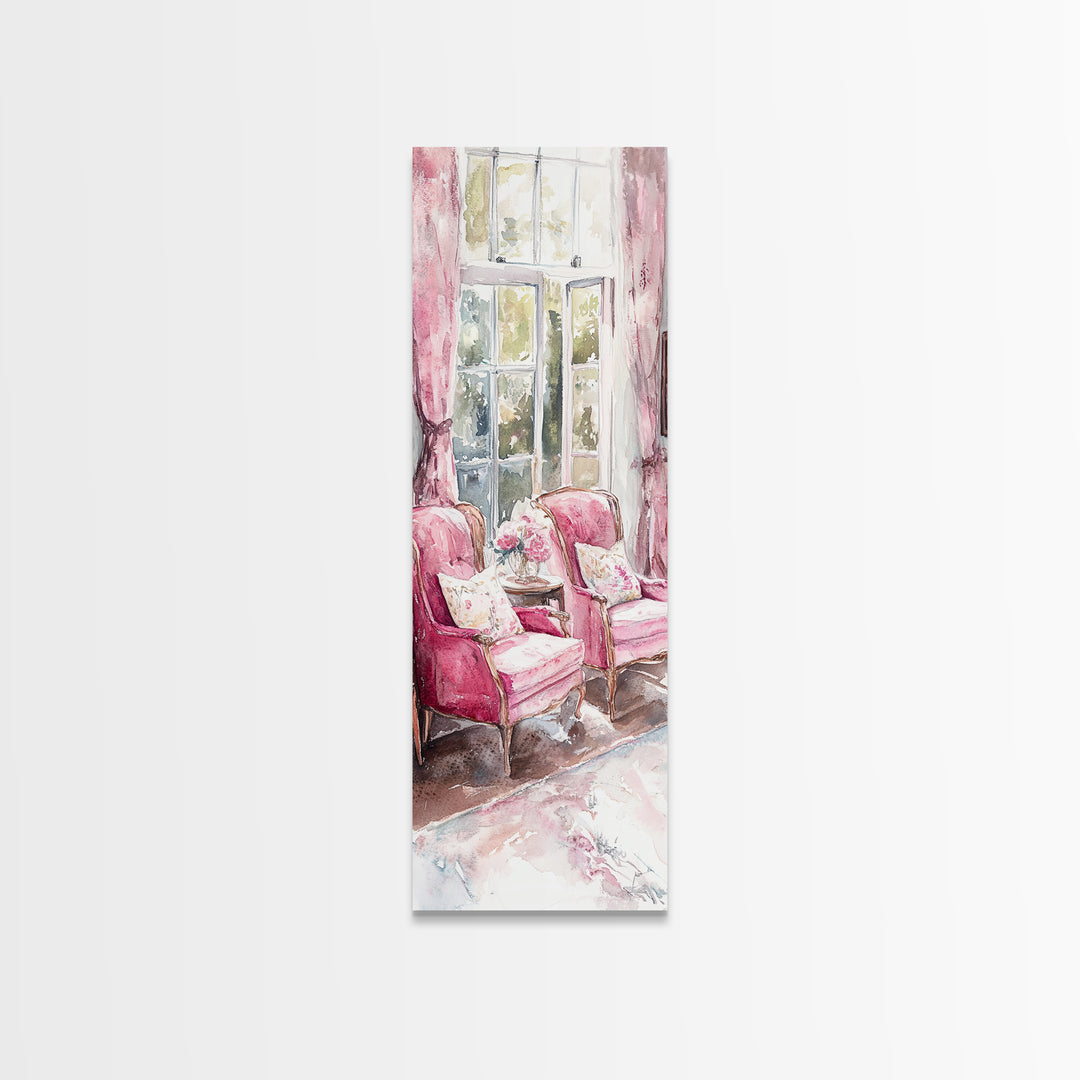 Romantic Pink Chairs Framed Canvas Print, Light Pink Living Room Art Cottagecore Decor, Vintage Rustic Art Above Couch Gift Idea