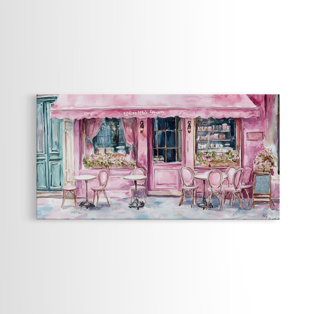Romantic Pink Café Framed Canvas Print, Cottagecore Art, Vintage European Charm, French Coffee Shop Painting, Wall Art Decor Gift Idea