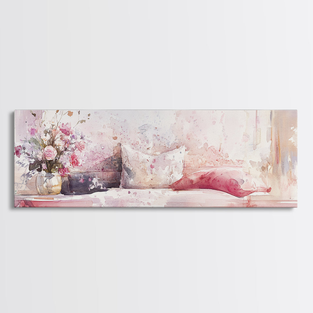 Romantic Floral Vase Canvas Print in Pink Abstract Art, Wabi Sabi Boho Aesthetic, Cottagecore Living Room or Guest Room Horizontal Art