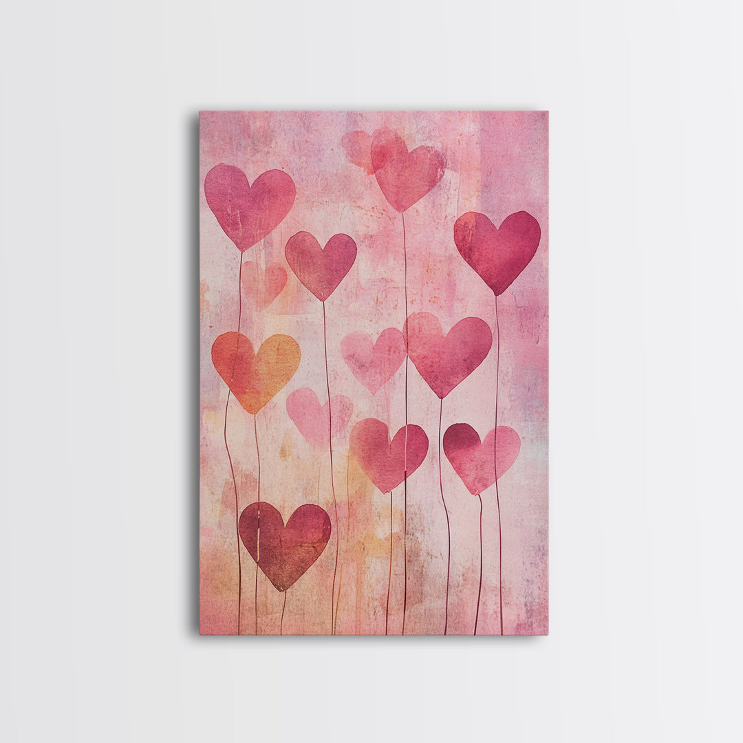 Romantic Heart Balloons Framed Canvas Print, Pink Wall Art, Valentine’s Day Aesthetic, Whimsical Cottagecore Art, Bedroom Decor Gift Idea