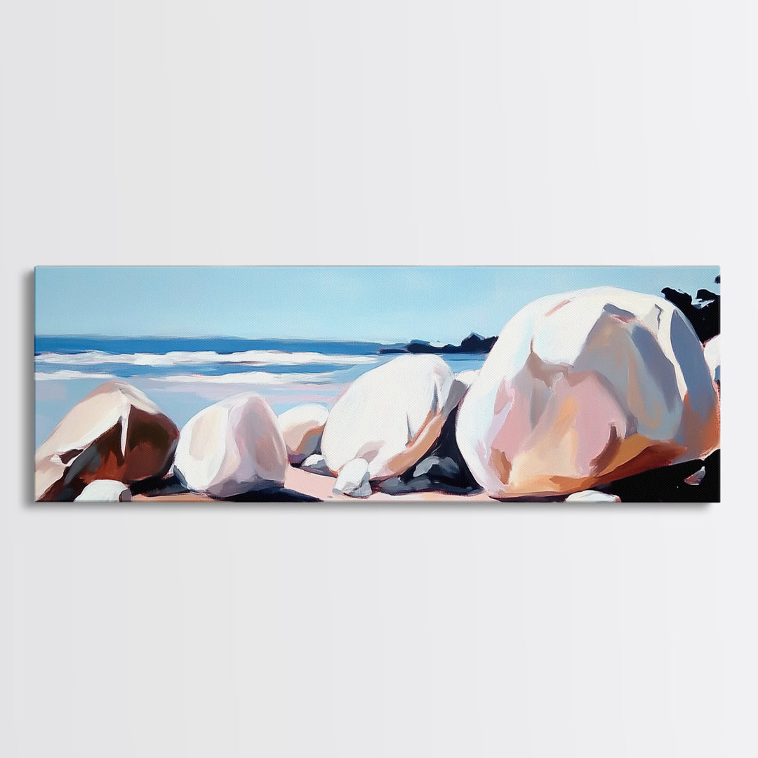 Ocean Rocks, Beach Vibes, Soft Pastel Colors, Framed Canvas Print, Coastal Wall Art, Minimalist Seascape, Calm Water Scene, Neutral Decor
