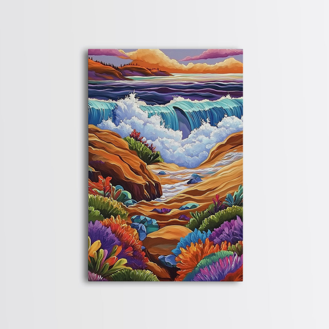 Ocean Rocks, Colorful, Framed Canvas Print, Coastal Sunset Wall Art, Bold Ocean Waves Decor, Living Room Statement Piece, Nature Art Print