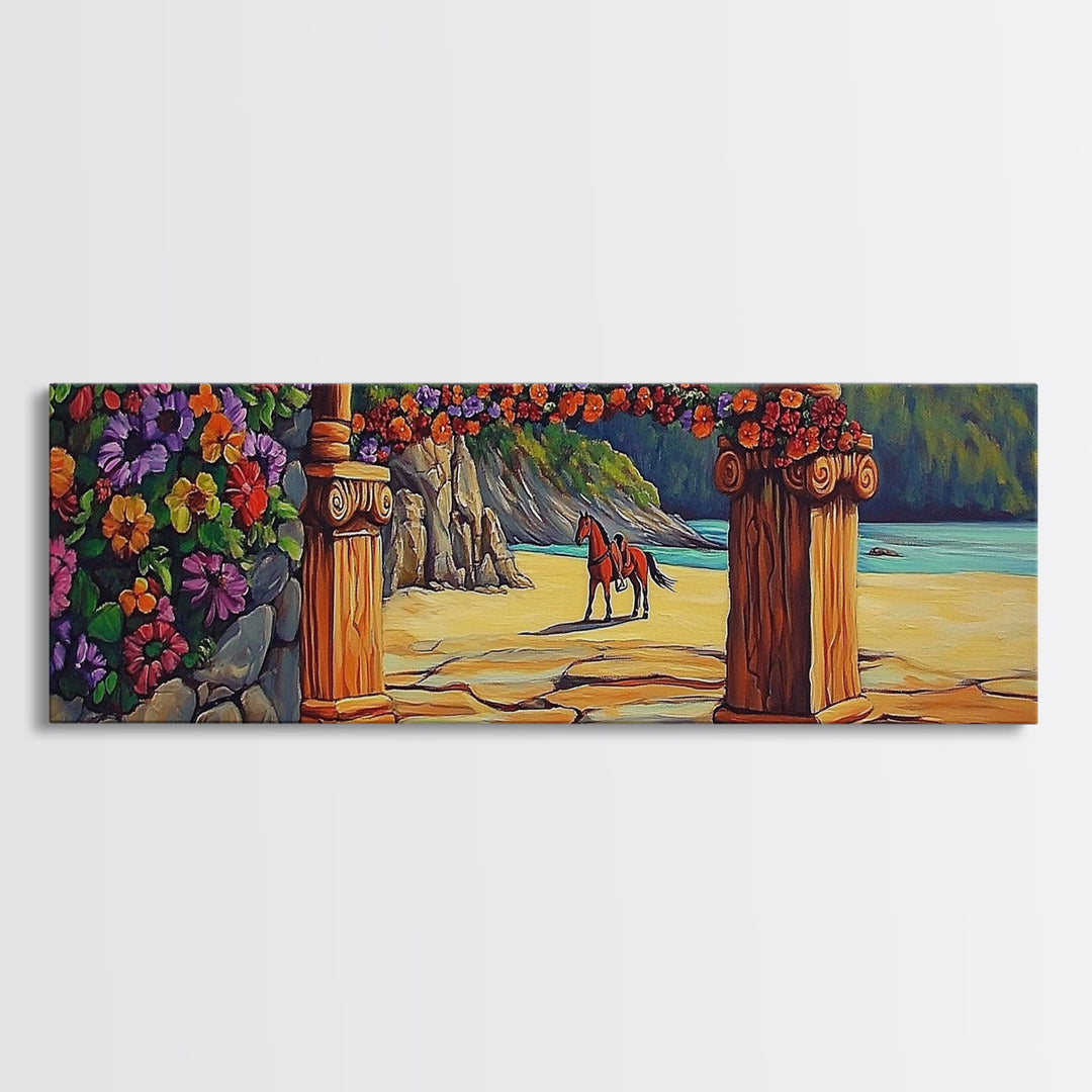 Romantic Horse Beach, Floral Arch, Ancient Columns, Framed Canvas Print, Rustic Wall Decor, Bedroom Wall Art, Colorful Boho Art