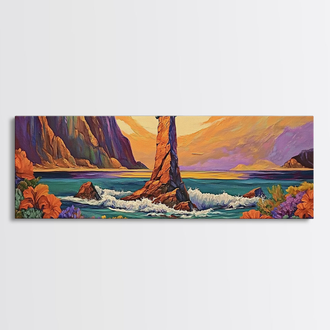 Ocean Rock Island, Sunset Coastline, Floral Foreground, Canvas Print, Living Room Wall Art, Mystical Nature Landscape
