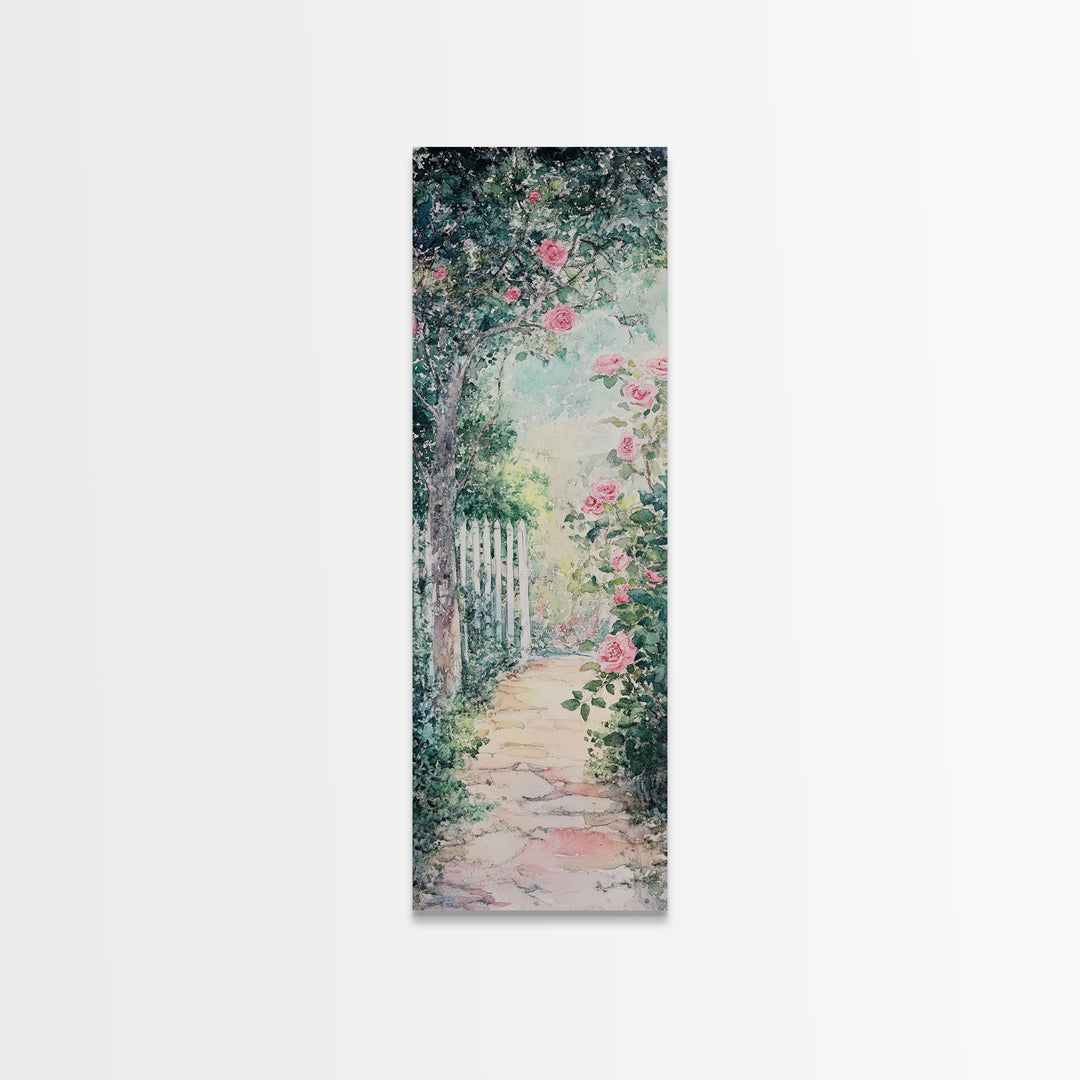Rose Garden Rustic Landscape Framed Canvas Print | Cottagecore Vertical Wall Art | Above Sofa Whimsical Nature Painting | Gift Idea