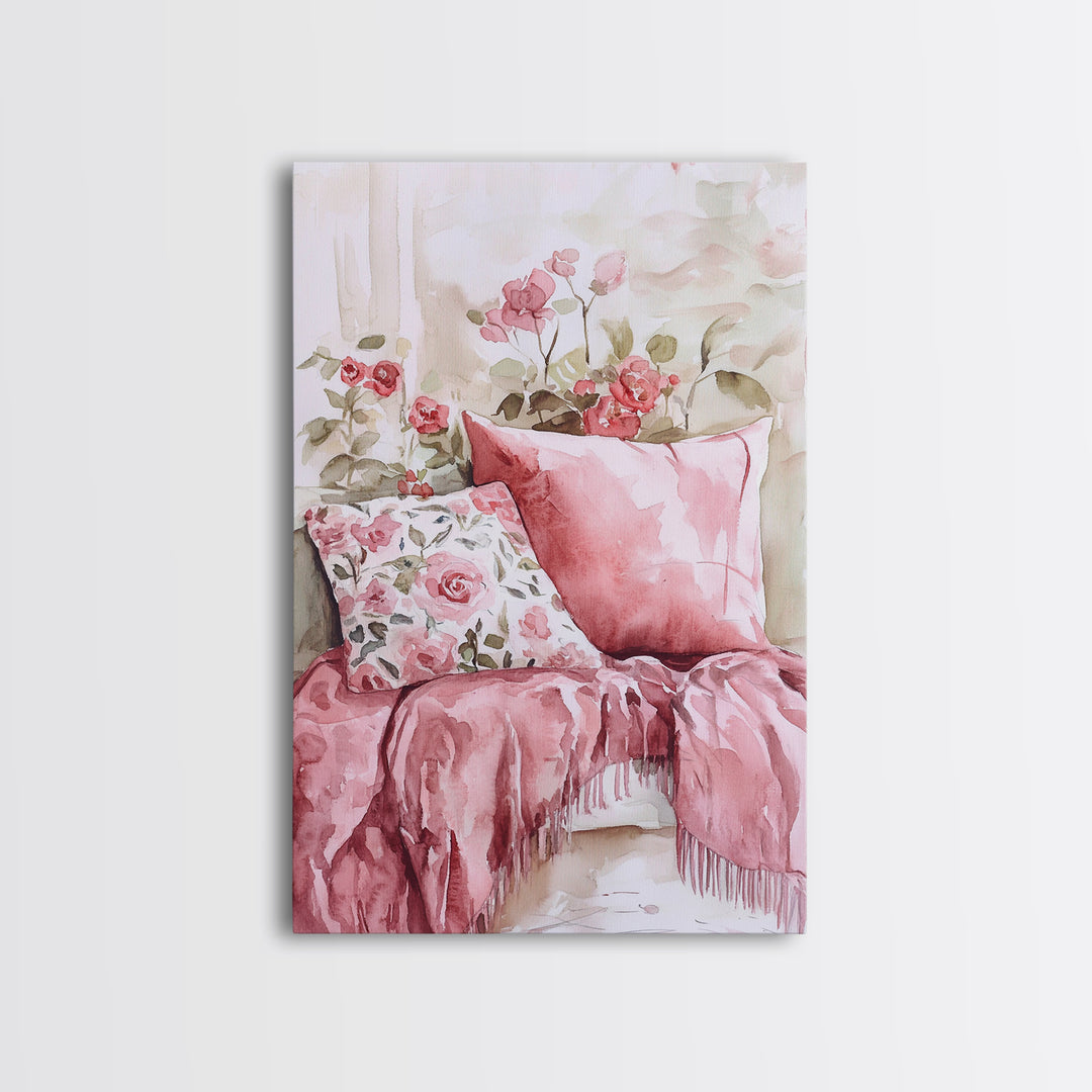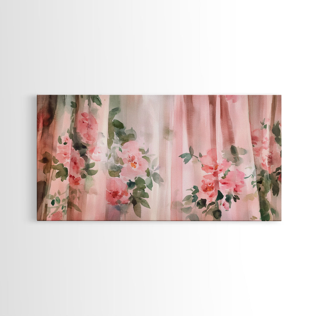 Rose Curtains Painting Canvas Print, Light Pink Wall Art, Cottagecore Romantic Decor, Feminine Rustic Artwork Gift Idea