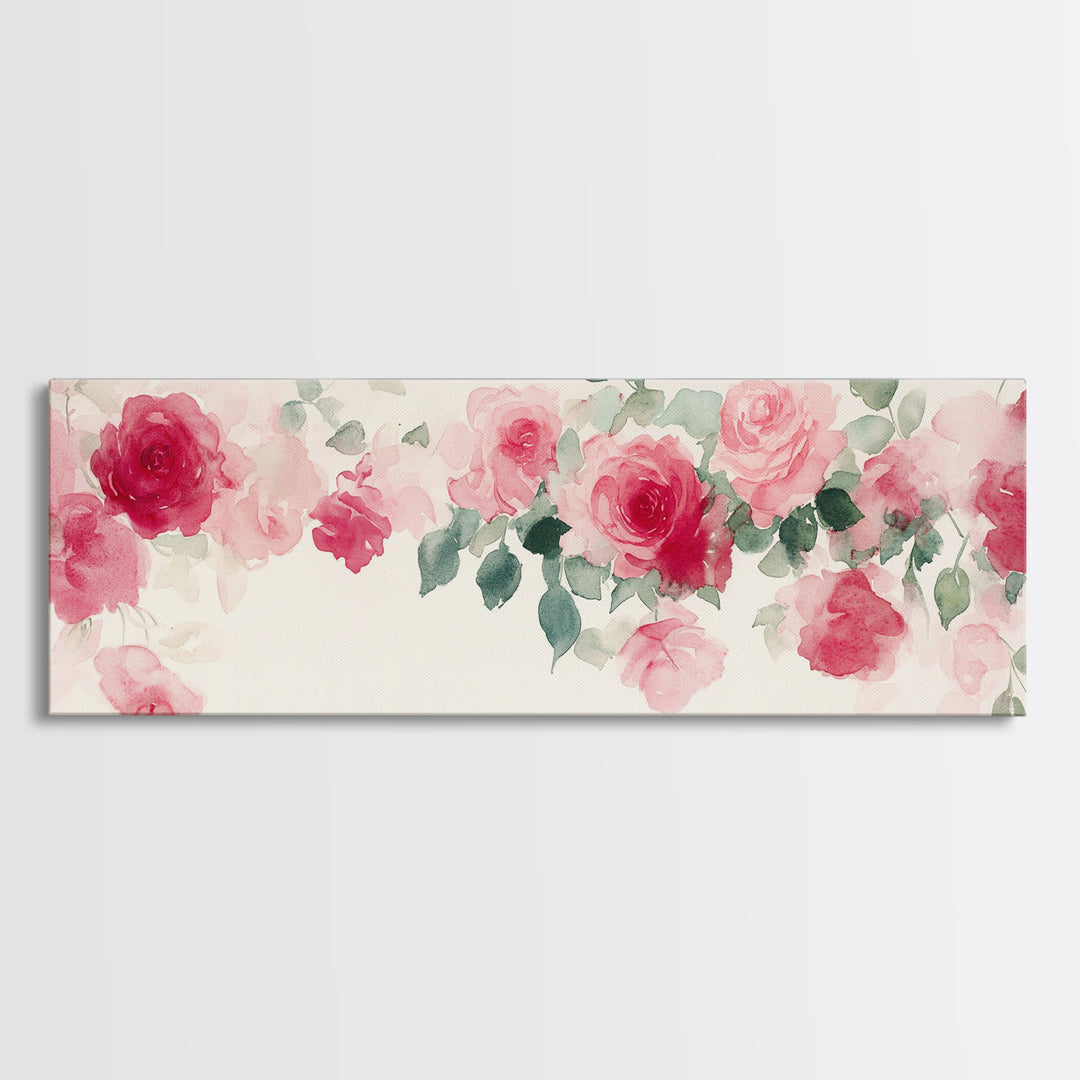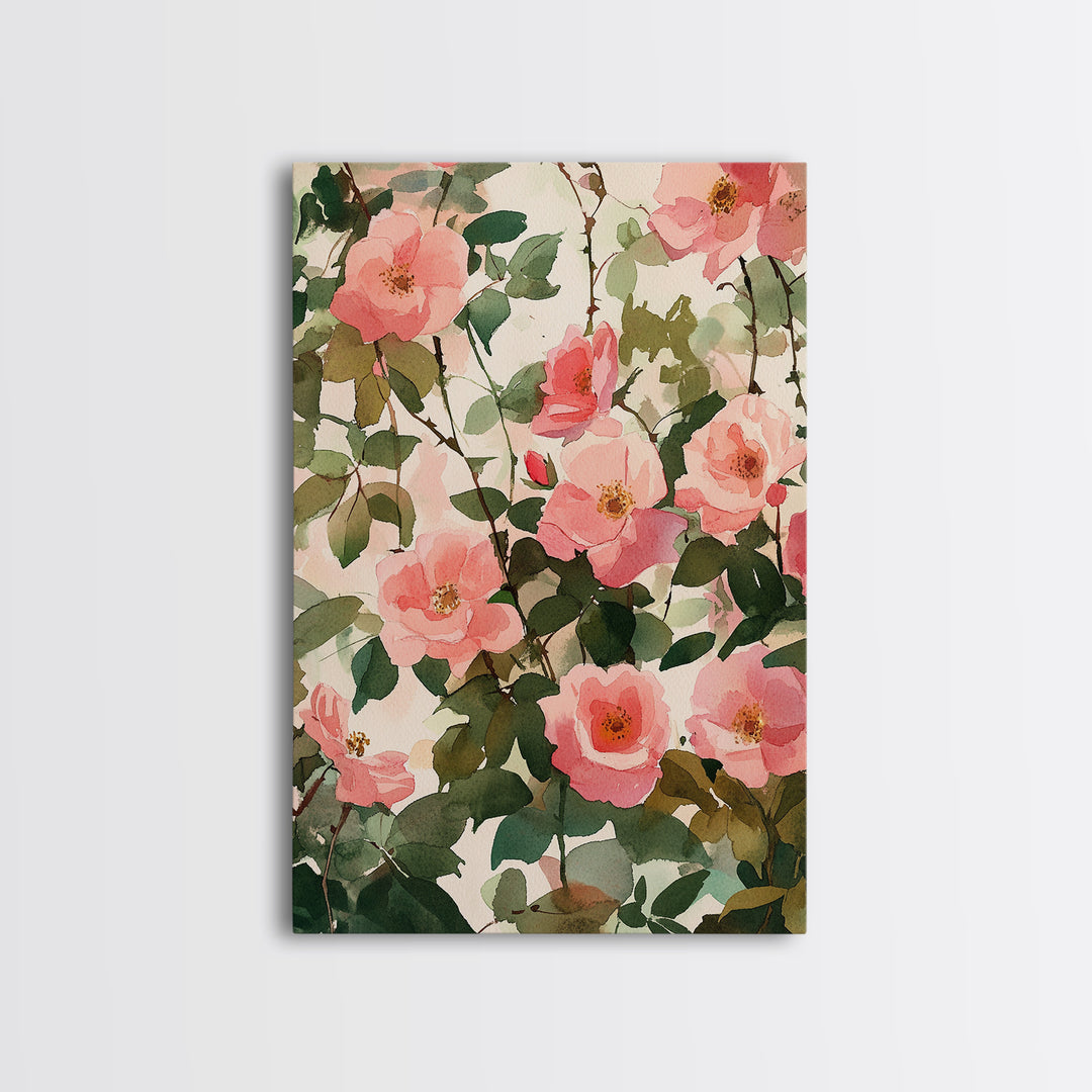 Rose Garden Canvas Print with Botanical Pink Wall Art Theme, Cottagecore Minimalist Decor, Bedroom or Living Room Floral Artwork