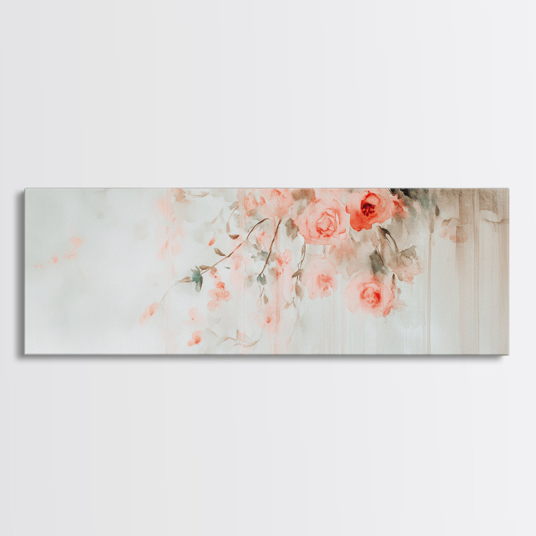 Rose Painting Framed Canvas Print of Soft Peach and Pink Florals, Cottagecore Botanical Prints, Vertical Rustic Wall Art Idea