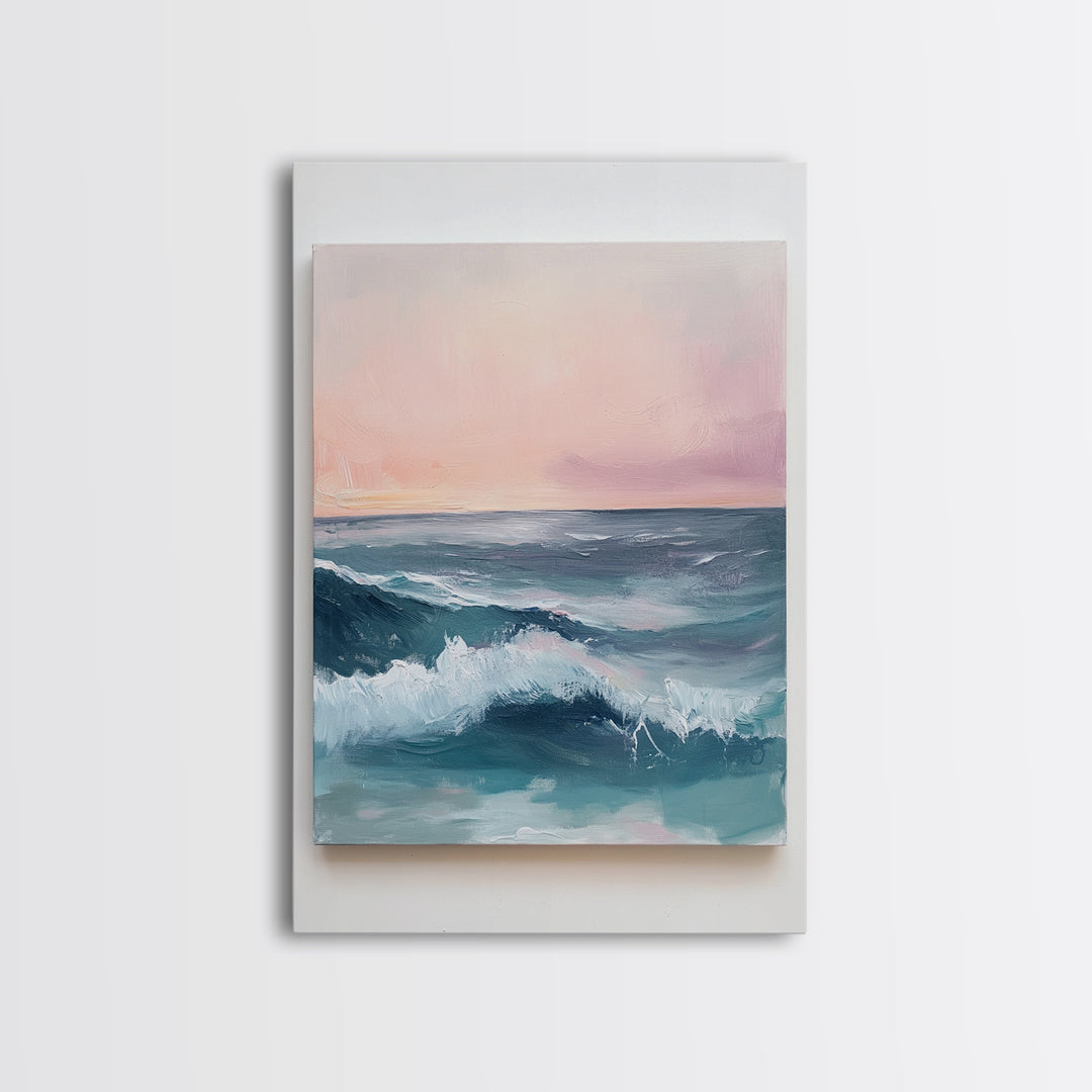 Ocean Sunset, Abstract Seascape Art, Framed Canvas Print, Beach House Wall Art, Modern Coastal Decor, Pink Sky Painting, Bedroom Artwork
