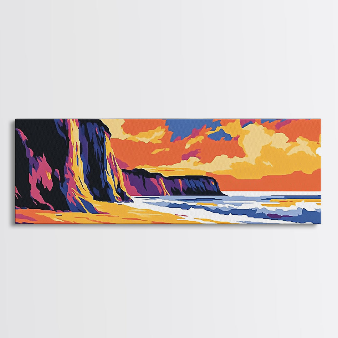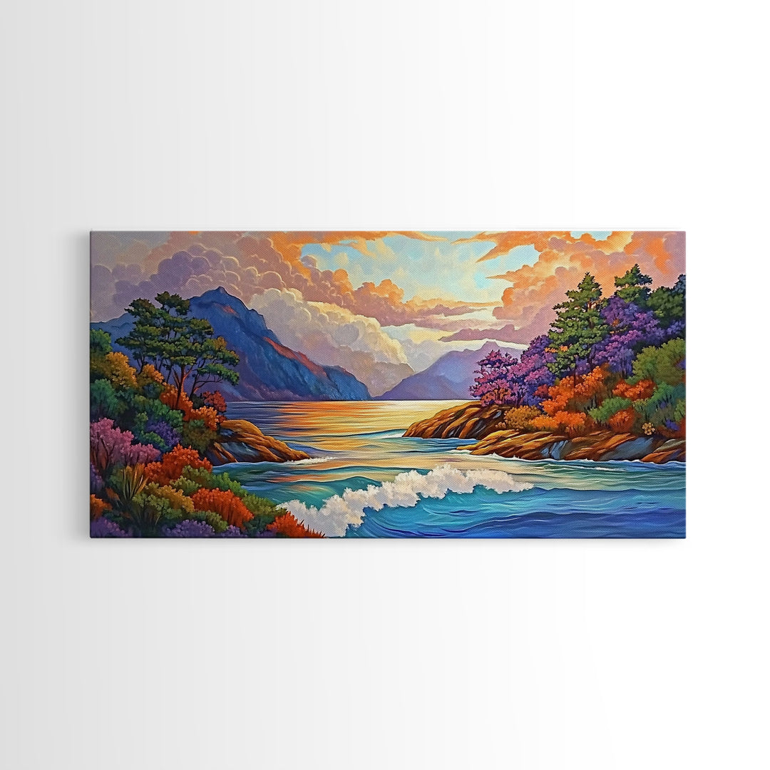 Ocean Sunset View, Vibrant Coastline, Mountain Landscape, Canvas Print, Living Room Wall Art, Colorful Seascape, Nature Painting