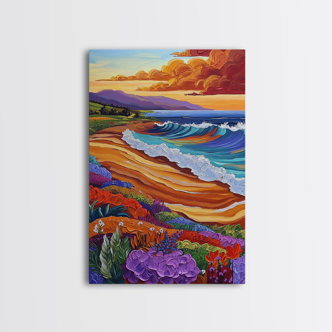 Ocean Sunset, Colorful Beach, Coastal Vibes, Tropical Flowers, Fall Wall Art, Dining Room Decor, Canvas Print, Vibrant Landscape Art
