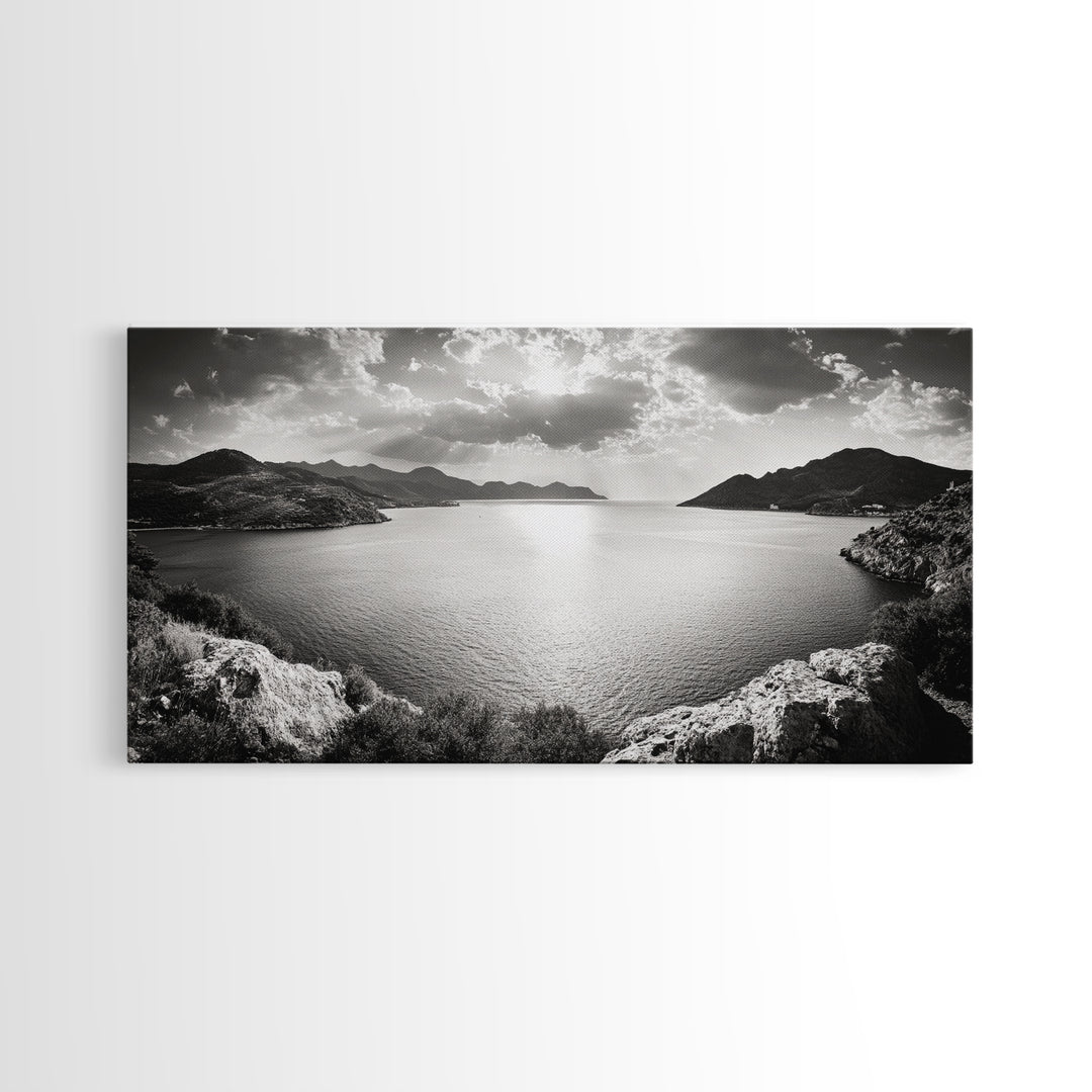Ocean Sunset View, Mountain Coast Landscape, Black and White Art, Canvas Print, Minimalist Decor, Living Room Wall Art, Tranquil Home Style
