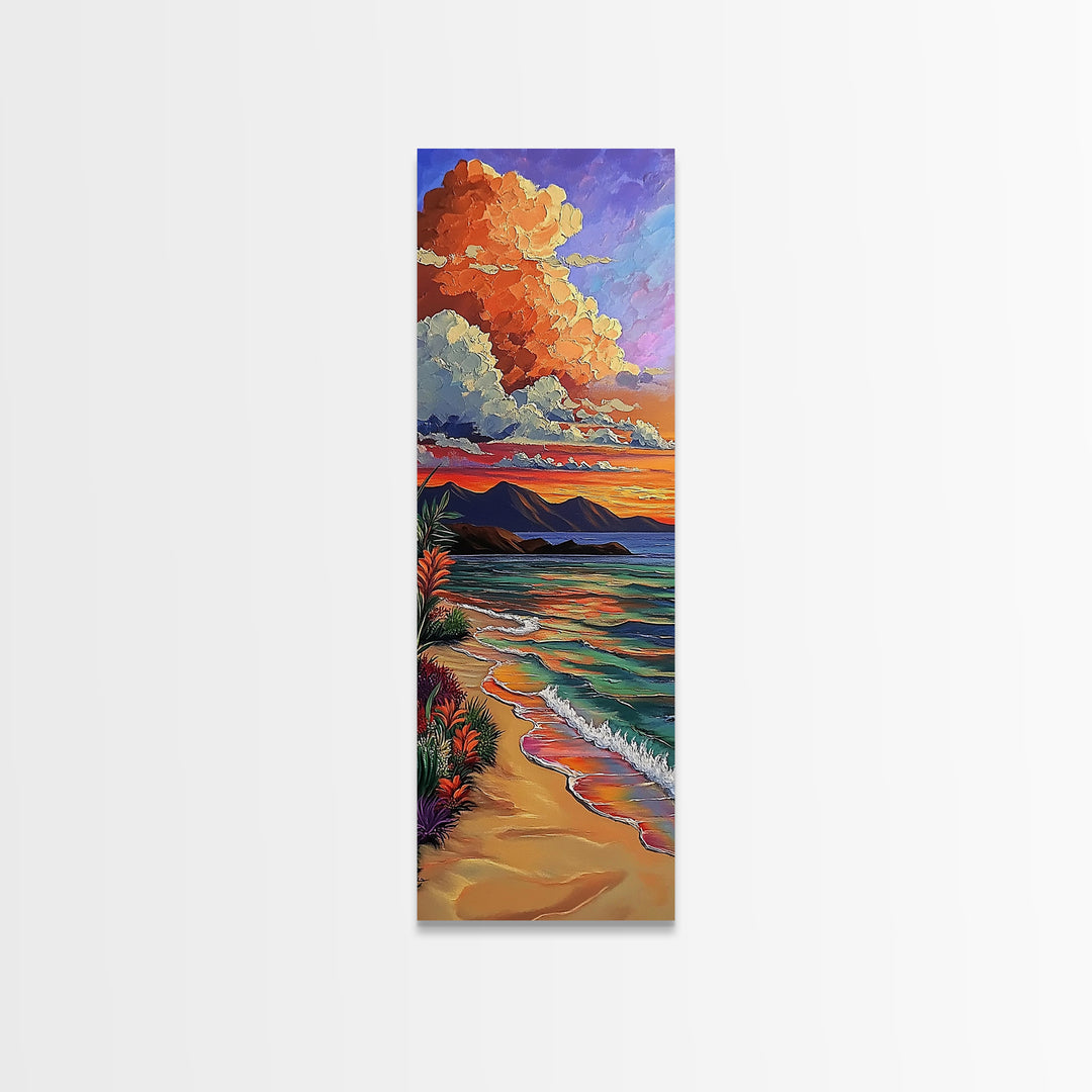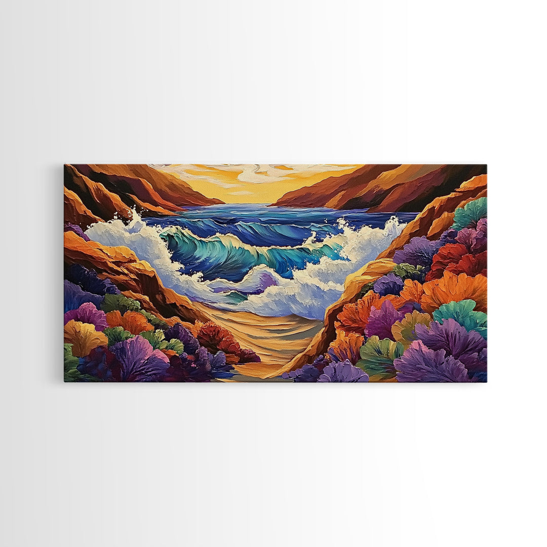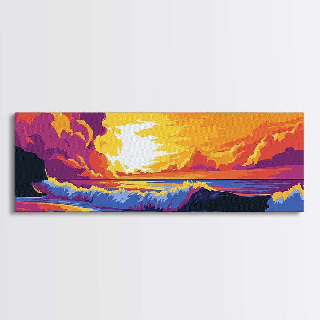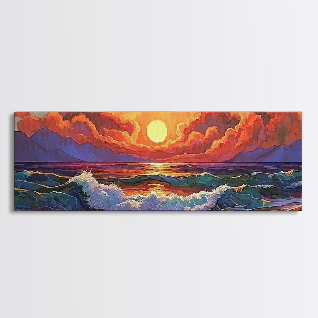 Ocean Sunset, Vibrant Sky, Crashing Waves, Bold Color, Framed Canvas Print, Coastal Wall Art, Living Room Decor, Maximalist Art