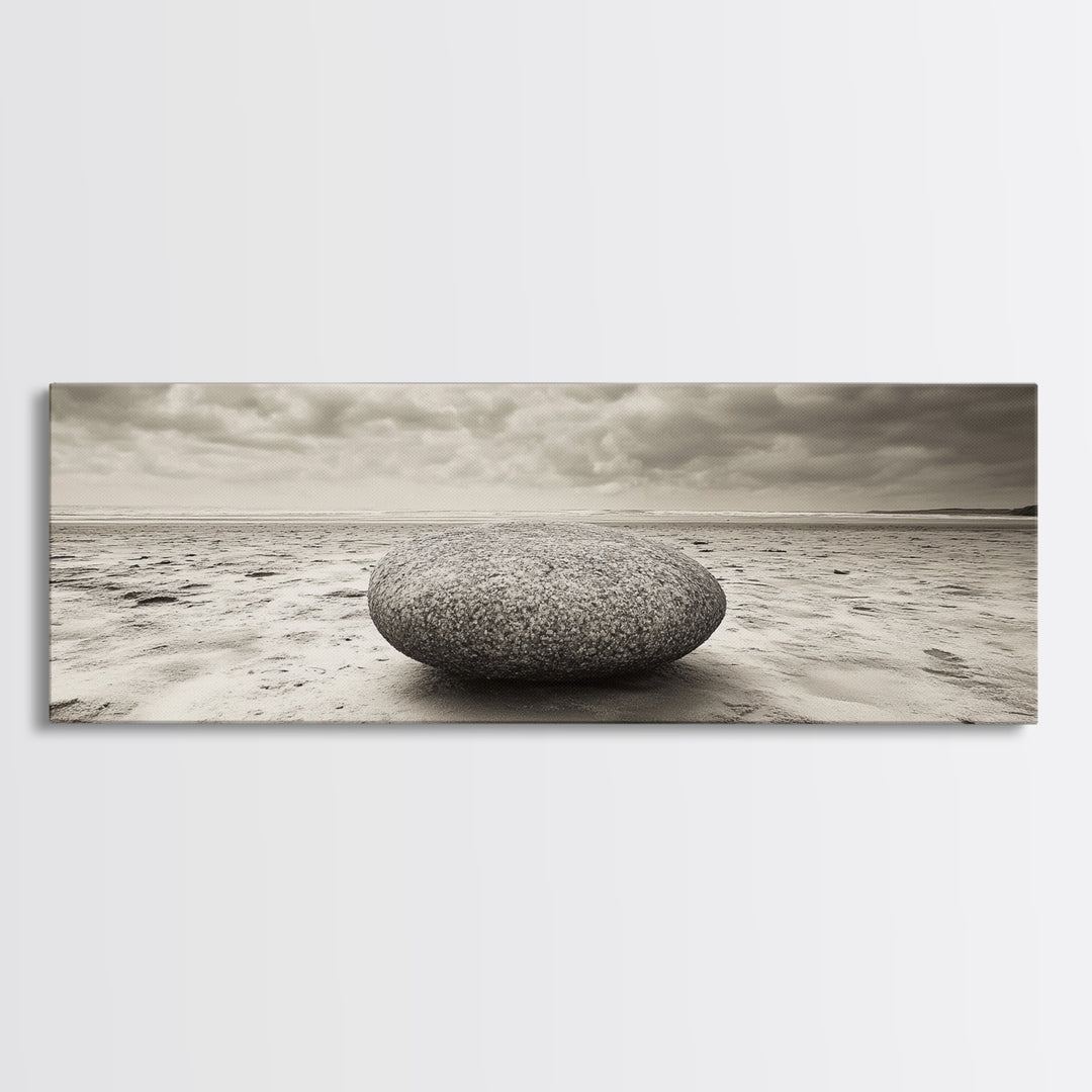 Round Beach Boulder, Serene Shore, Natural Simplicity, Neutral Toned Framed Canvas Print, Minimalist Living Room or Yoga Wall Art