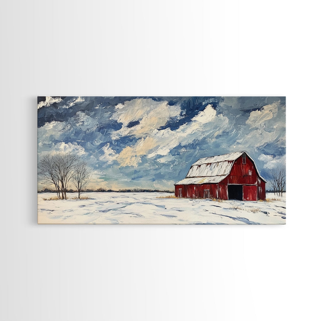 Rustic Barn in Winter Canvas Print, Farmhouse Christmas Decor, Wall Art, Seasonal Winter Wonderland, Perfect Gift Idea, Framed Canvas Print