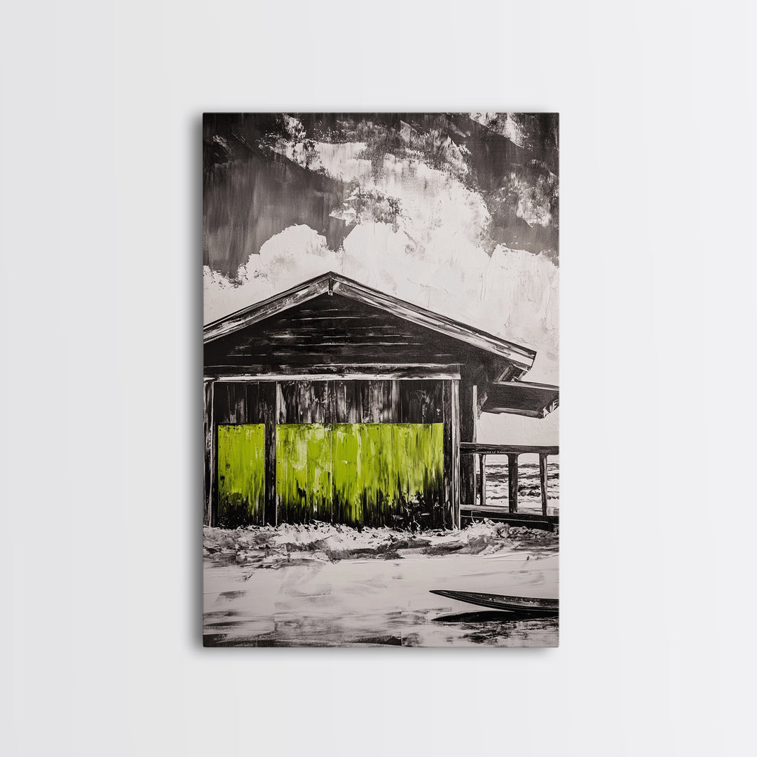 Rustic Barn Painting, Black White Green, Vintage Farmhouse Wall Art, Minimalist Rural Decor, Country Home Artwork, Framed Canvas Print