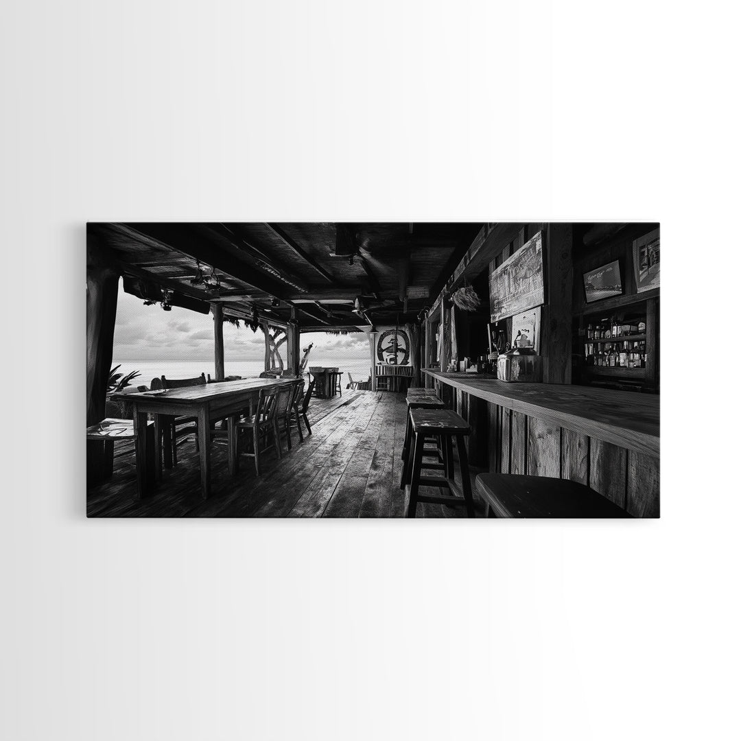 Rustic Bar, Ocean View, Coastal Tavern, Wooden Interior, Framed Canvas Print, Vintage Kitchen Art, Nautical Decor, Boho Vibes
