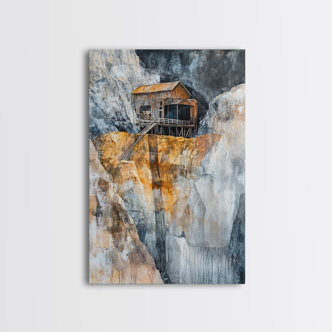 Rustic Cabin on Cliff, barn landscape painting, rustic art, farmhouse art, wabi sabi art, vintage horse art, Framed Canvas Print