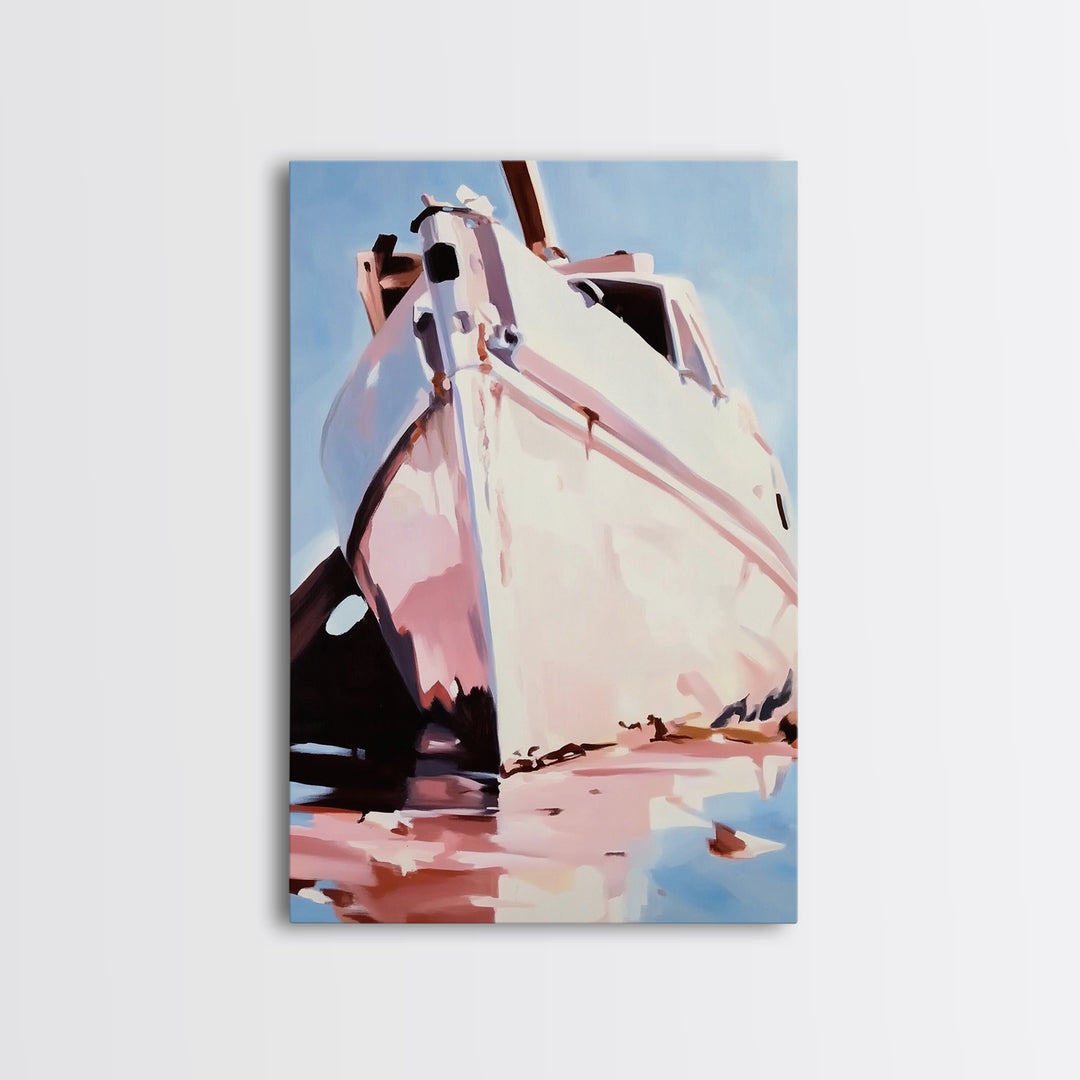 Rustic Boat, Nautical Wall Art, Coastal Home Decor, Seaside Aesthetic, Soft Pastels, Framed Canvas Print, Living Room