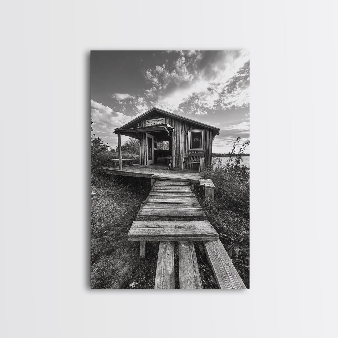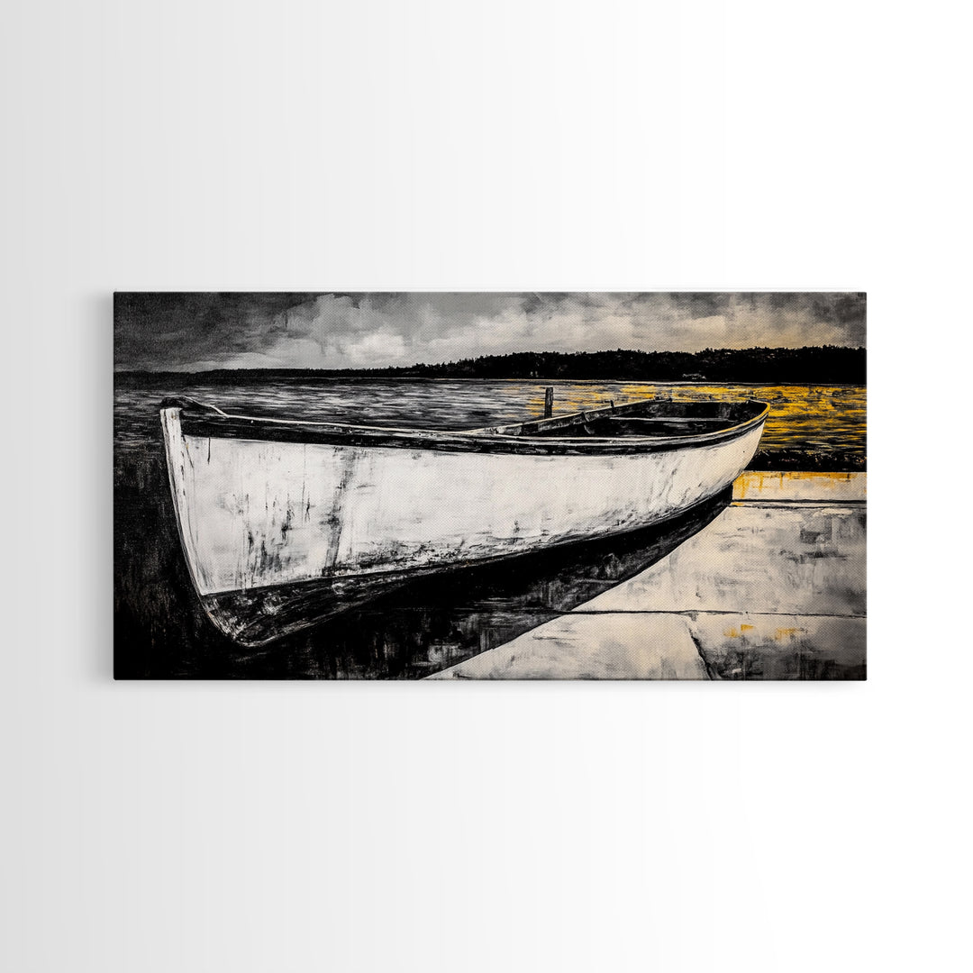 Rustic Boat, Lakeside View, Vintage Vibes, Canvas Print, Nautical Art, Cabin Decor, Living Room Wall Art, Black and White Landscape