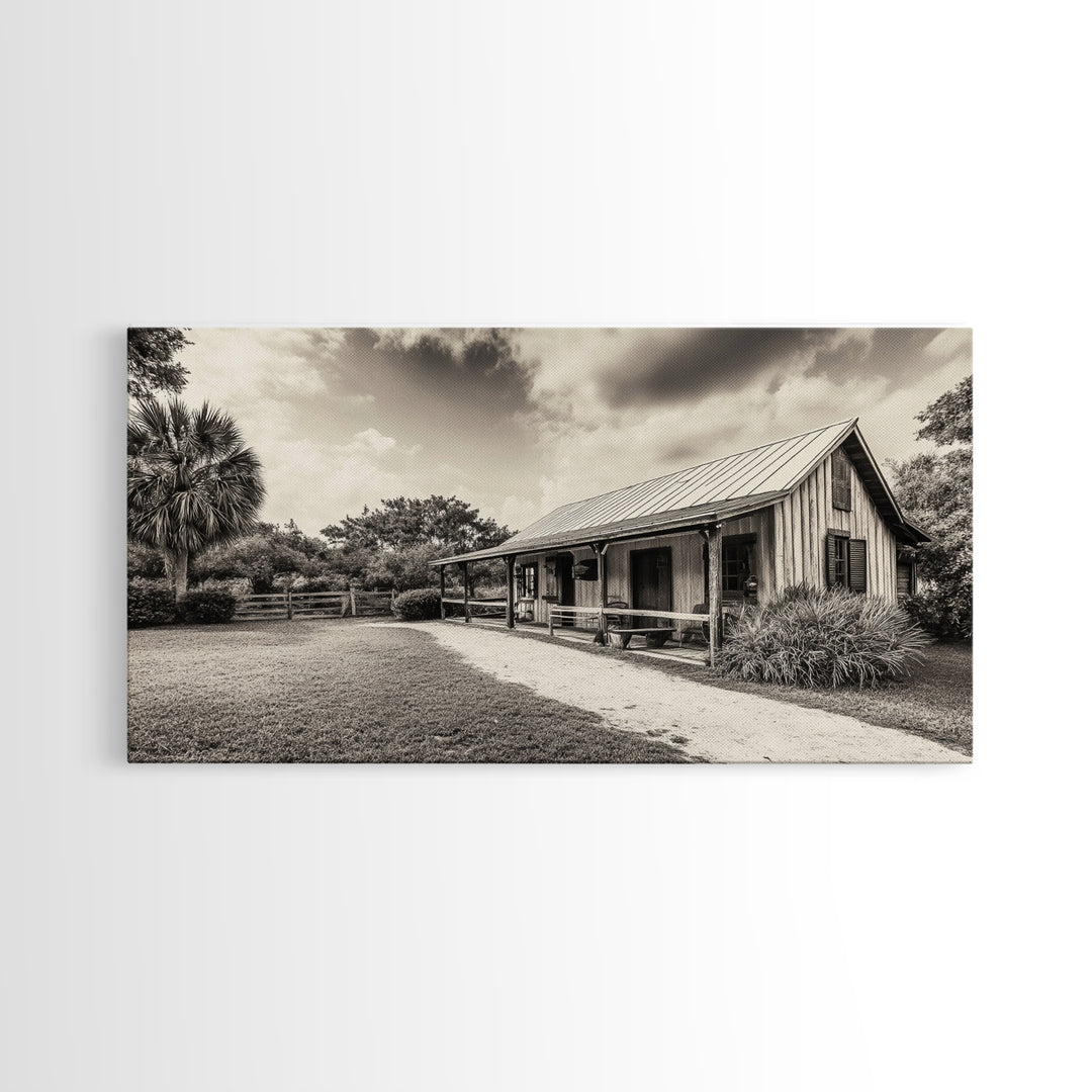 Rustic Cabin, Countryside Road, Farm Field, Palm Trees, Framed Canvas Print, Farmhouse Entryway Wall Art, Fall Landscape, Den Wall Art