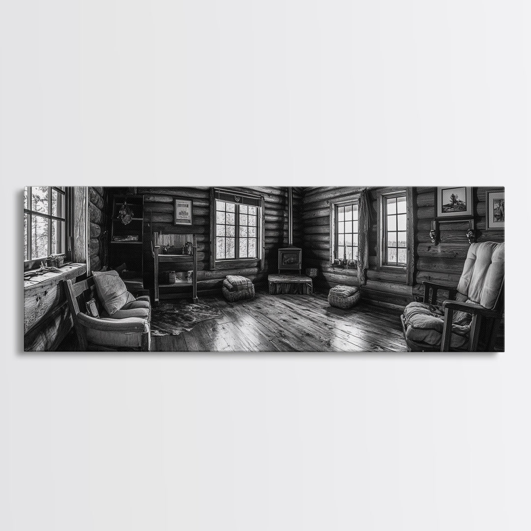 Rustic Cabin, Cozy Interior, Nature Retreat, Framed Canvas Print, Living Room Wall Art, Black and White Photography, Lodge Decor
