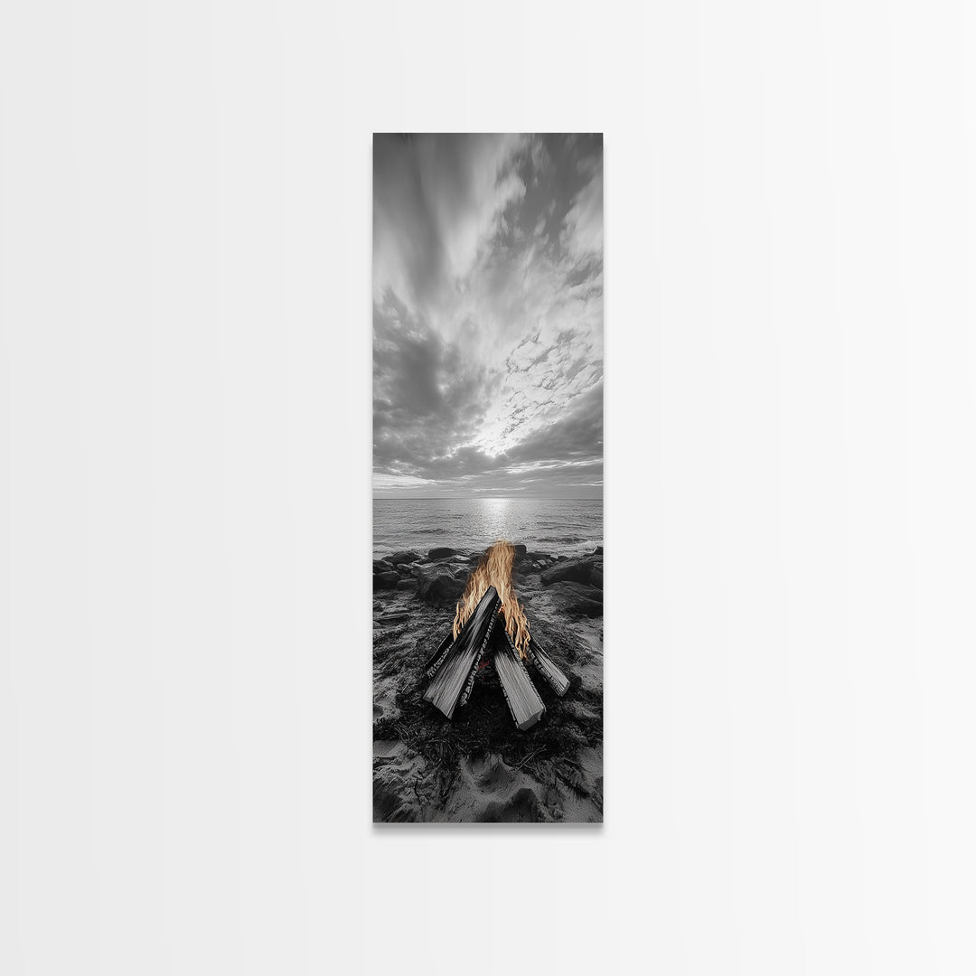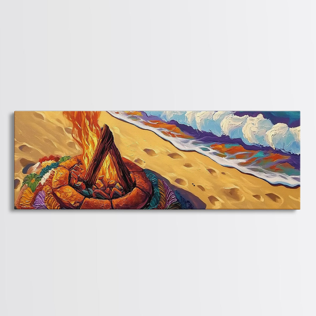 Beach bonfire, coastal decor, surf wall art, nautical painting, ocean fire, rustic wall art, horizontal wall art, canvas print, seascape