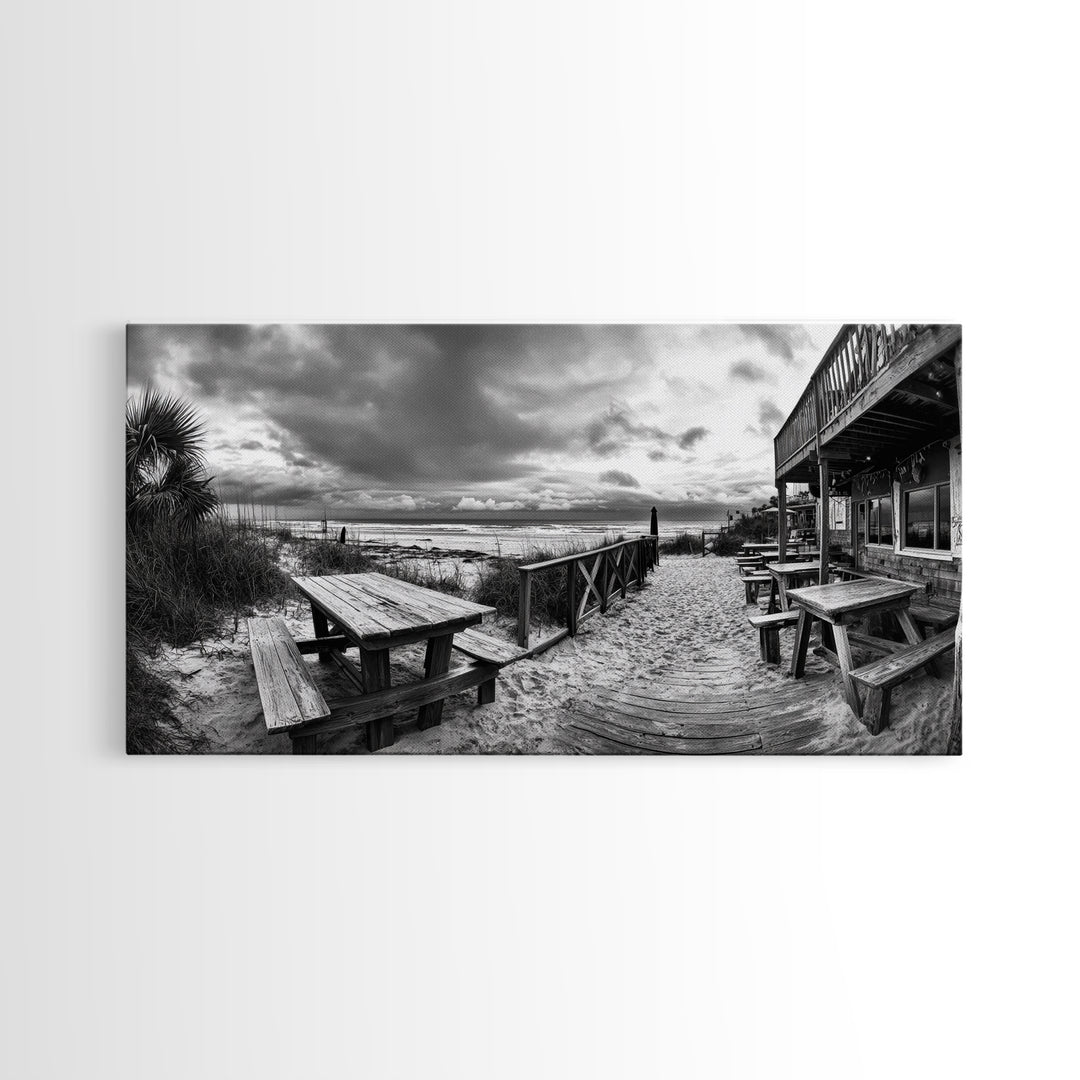 Beach Boardwalk, Coastal Restaurant, Moody Seaside View, Framed Canvas Print, Kitchen or Bar Wall Art, Rustic Autumn Decor