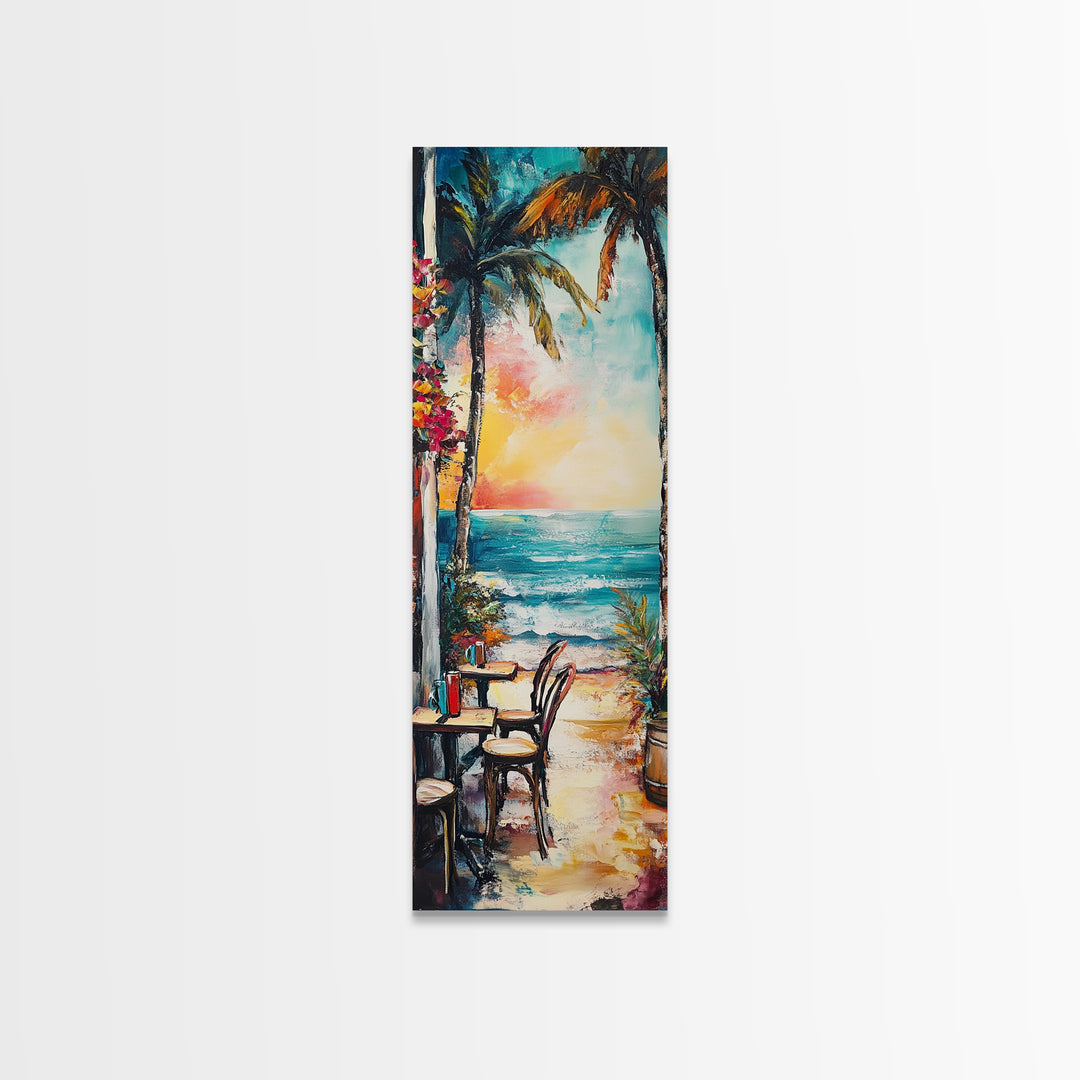 Beach Cafe, Sunset View, Coastal Landscape Art, Nautical Painting, Cottagecore Wall Art, Boho Art, Framed Canvas Print, Above Sofa Art