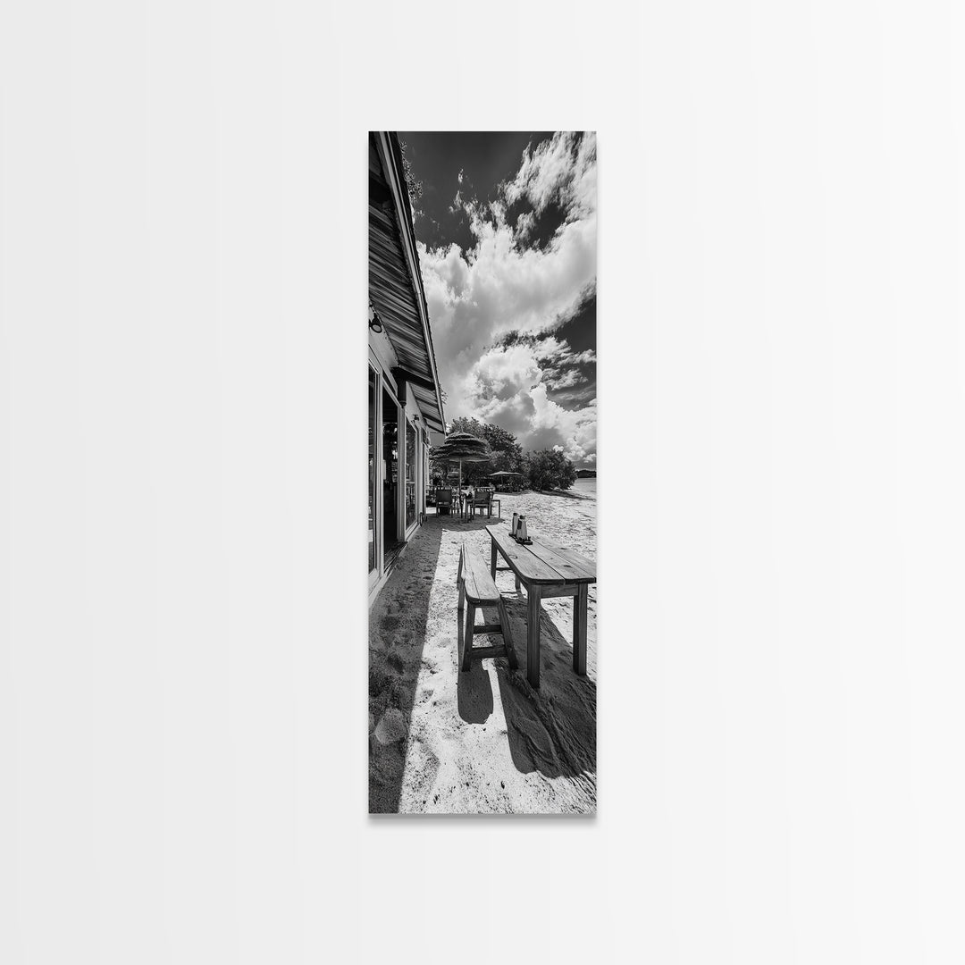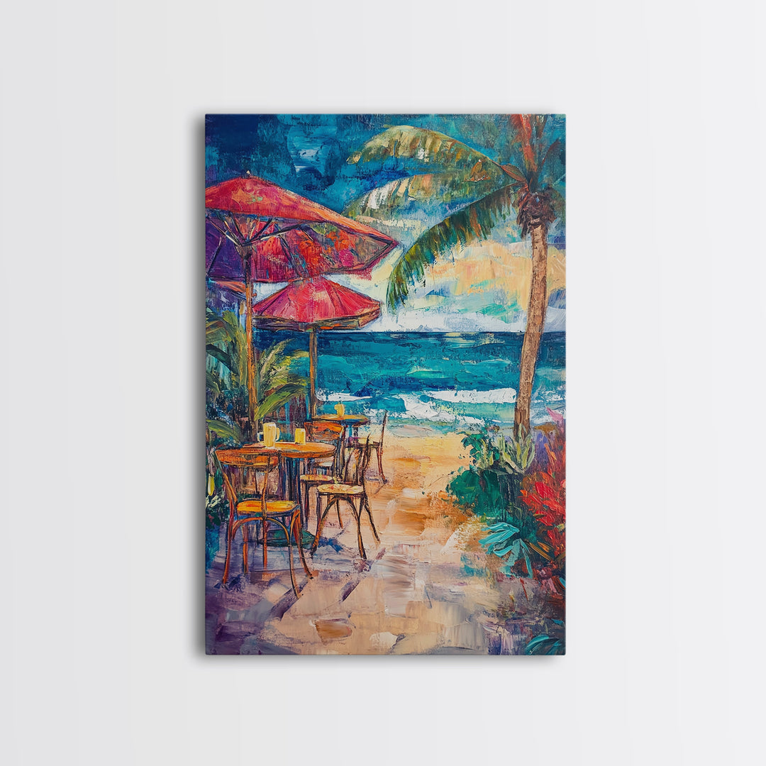Beach Café Table, Seaside Dining, Rustic Seating, Tropical Getaway, Framed Canvas Print, Kitchen Wall Art, Coastal Rustic Aesthetic