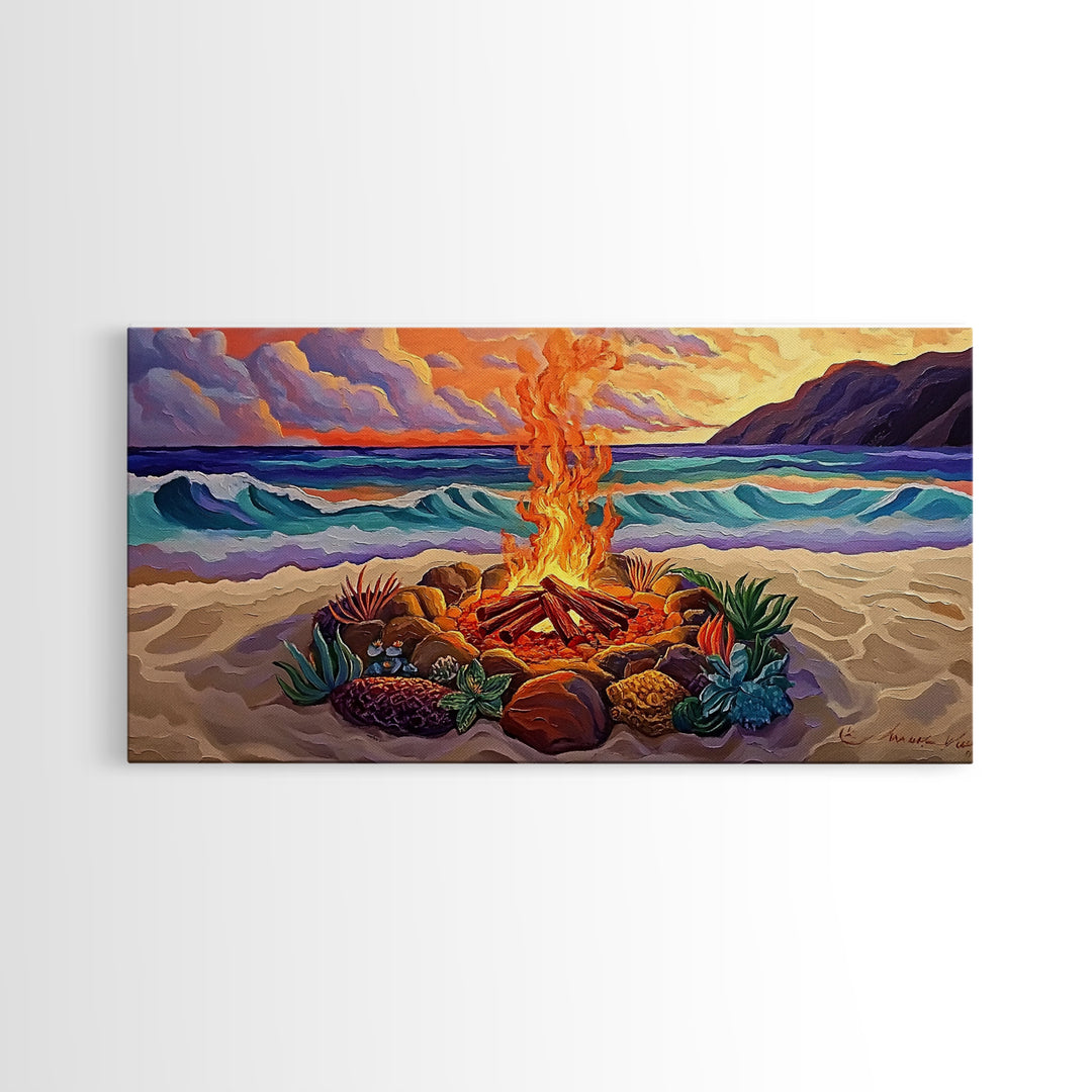 Beach Campfire, Sunset, Tropical Vibes, island evening Canvas Print, fall boho decor, colorful beach firepit living room wall art