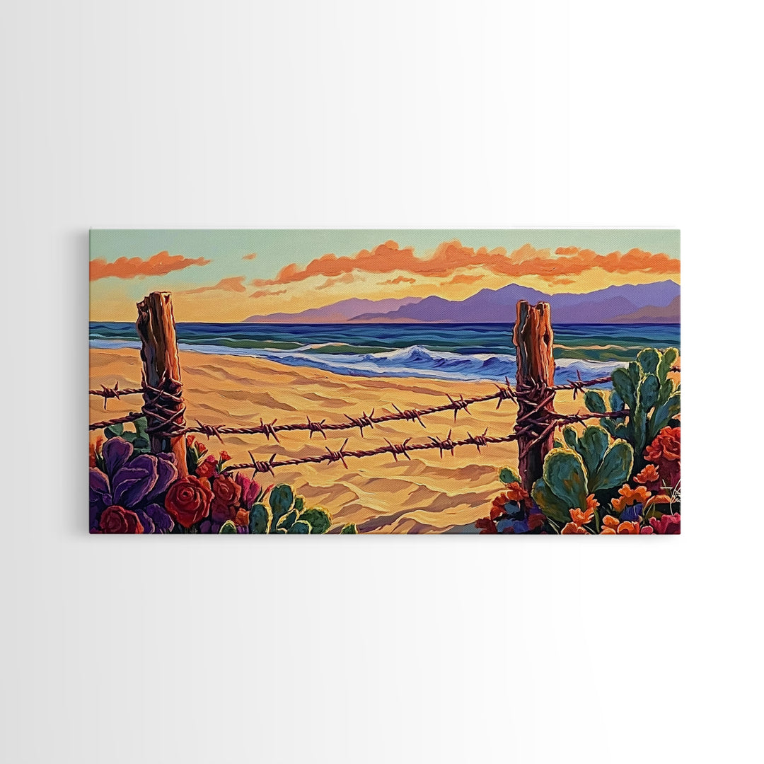 Beach Cactus, Fence, Framed Canvas Print, Vibrant Desert Beach Landscape, Colorful Boho Western Decor, Southwestern Living Room Art